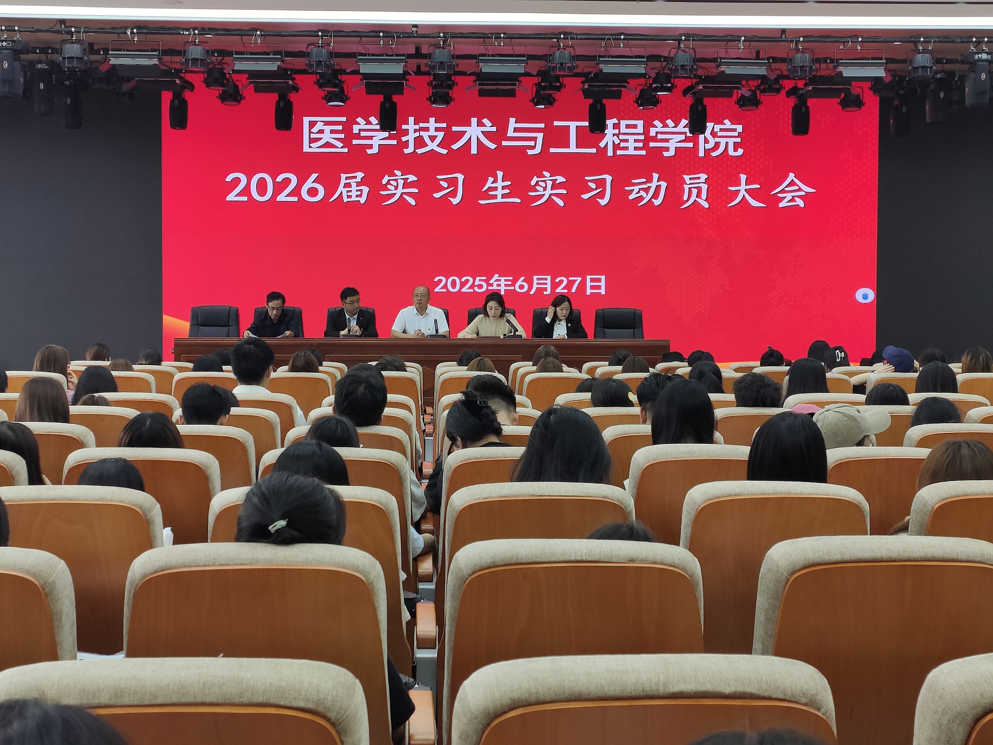 2025年6月27日13时,医学技术与工程学院在学校图书馆4楼多功能报告厅召开2026届实习生实习动员教育大会。学院领导班子成员、教研室主任、实习指导教师、辅导员以及全体2026届实习生参加本次活动。
