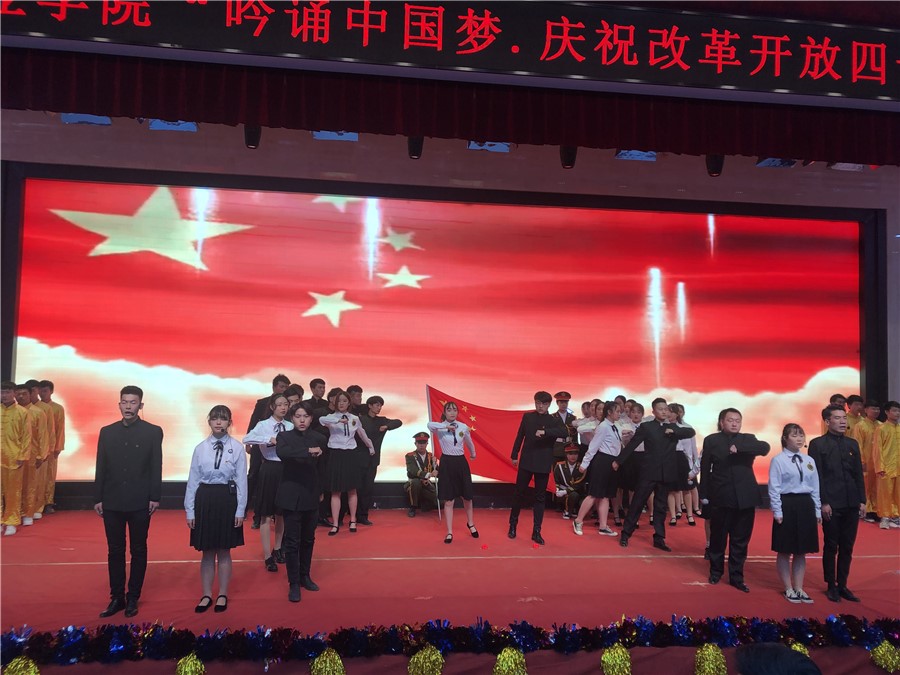 为庆祝改革开放四十周年,丰富校园文化生活,激发广大青年的爱国主义热情,增强爱国意识,引导广大团员青年积极弘扬社会主义核心价值观,树立坚定的理想信念。12月13日晚,学校团委举行“吟诵中国梦·庆祝改革开放四十周年”朗诵比赛活动。校领导刘生肸、任世伟、黄刚、赵建泽及500余名师生代表共同观看演出。