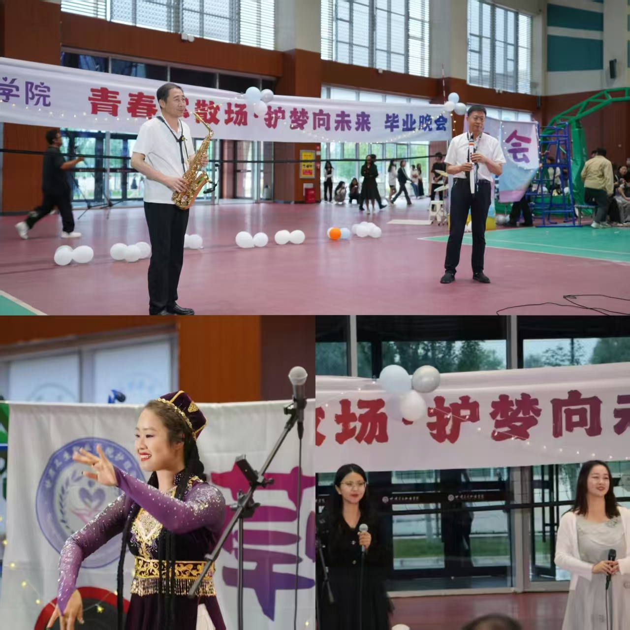 晚会分为三个篇章。第一篇章“青矜逐梦·韶光剪影”,兰谣乐团节奏强烈的摇滚、金属类曲目燃爆现场;蔡润喜、韩忠两位老师以萨克斯演绎《小苹果》,别出心裁,赋予熟悉旋律优雅与热情;李甜等同学演唱的《若是月亮还没来》,歌声空灵,唱出青春的憧憬;祁晓阳等同学的《非遗舞狮》将毕业晚会推向高潮。第二篇章“栉风沐雨·薪火相承”,舞蹈队的古典舞《鸳鸯戏》如诗意画卷,尽显古代爱情浪漫与传统文化魅力;何若君、俞跃老师高歌《爱在天地间》,传递护理工作者的无私大爱;安妮儿其其格老师带来热情奔放的维吾尔族舞蹈《木卡姆-朱拉》,舞步轻盈,民族风情满溢。第三篇章“扬帆逐浪·星河共赴”,王申祥同学献上秦腔唱段《金沙滩》;安秀虎同学演唱的《我们的时光》、濮梦琪与蔡丹丹演唱的《同花顺》,为晚会增添温馨与欢乐氛围。晚会尾声,全体师生合唱《起风了》,天意乐队深情的歌声饱含着对校园的不舍与未来的憧憬。