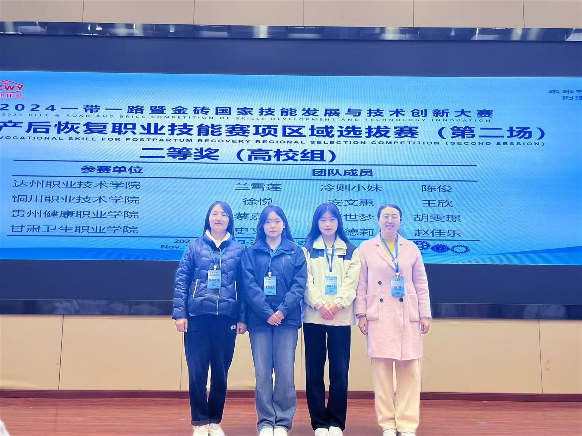 11月22日至24日,“2024一带一路暨金砖国家技能发展与技术创新大赛”首届产后恢复职业技能赛项选拔赛在四川达州职业技术学院举办。由365英国上市集团官网护理学院张艾丽、马晓燕两位老师指导的史文杰、张德莉、赵佳乐三位同学凭借扎实的专业技能和出色的临场表现,荣获大赛二等奖。
