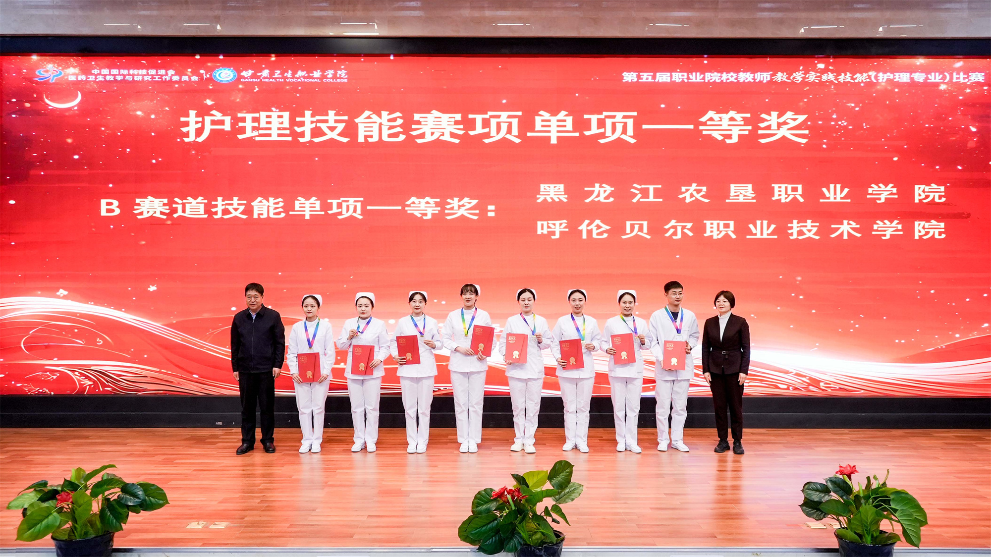 北京协和医学院护理学院原院长、中国国际科技促进会医药卫生教学与研究工作委员会主任、赛项执委会主任刘华平,中国国际科技促进会医药卫生教学与研究工作委员会执行主任、赛项执委会执行主任王文海,中国职业技术教育学会医药卫生教育专业委员会秘书长、赛项监督仲裁长高璀乡,天津中医药大学附属第一医院护理部主任、赛项裁判长董丽,复旦大学附属上海市第五人民医院护理部主任、赛项专家组组长顾艳荭,上海健康医学院教授、赛项专家组副组长周进祝,中国国际科技促进会医药卫生教学与研究工作委员会执行秘书长、赛项秘书长兼专家组专家牟琳,365英国上市集团官网党委书记包磊,365英国上市集团官网党委副书记、校长王建成等领导和专家出席闭赛式。
