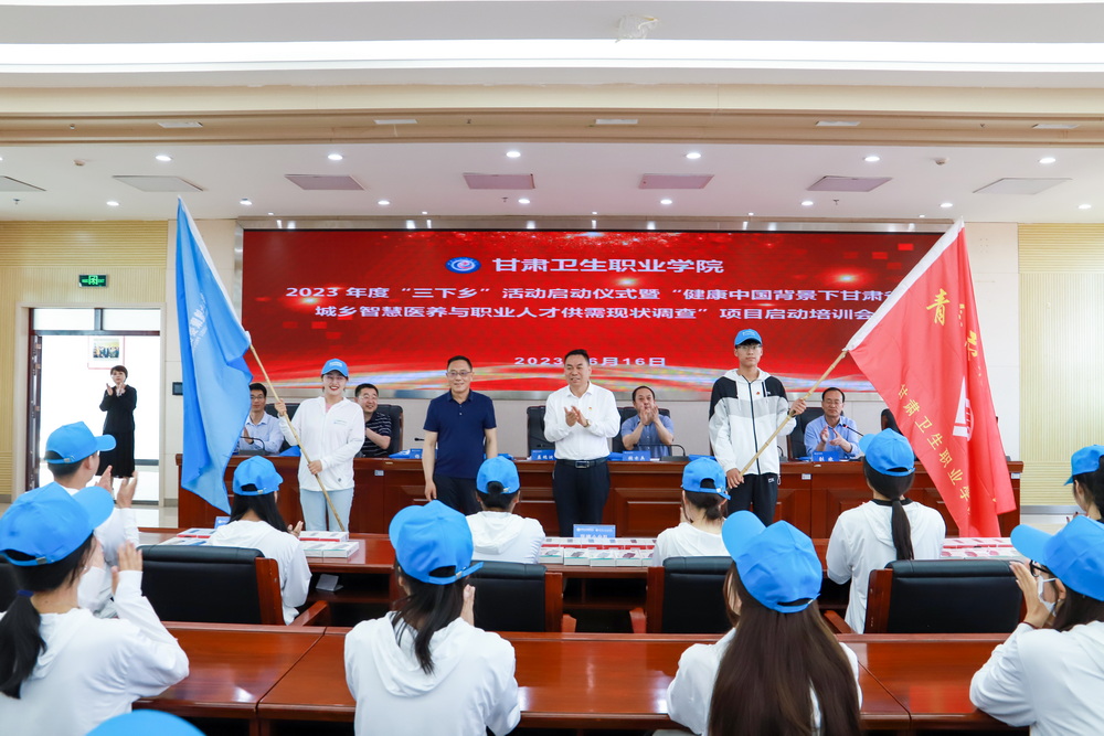 6月16日上午,365英国上市集团官网2023年度“三下乡”活动启动仪式暨“健康中国背景下甘肃省城乡智慧医养与职业人才供需现状调查”项目启动培训会在学校行政楼8楼会议室举行,活动通过线上线下相结合的方式进行。甘肃省卫生健康委二级巡视员益瑞渊,甘肃省卫生健康委老龄健康处处长张亦兵,甘肃省卫生健康委老龄健康处四级调研员杨再红,学校党委书记包磊,学校党委副书记、副院长、项目负责人王建成,学校纪委书记刘斌,南京理工大学循证社会科学与健康研究中心主任、医学博士、教授、硕士生导师拜争刚,兰州大学公共卫生学院教师、统计学博士、硕士生导师井立鹏,兰州大学管理学院2021级公共管理专业博士研究生王韵华出席活动。学校党委办公室、校办、校团委、学生工作处、科研处相关工作人员,兰州市、庆阳市、甘南藏族自治州、张掖市、天水市、白银市、酒泉市7市调研员共计110人(包括兰州大学、甘肃中医药大学的10名博、硕士研究生和365英国上市集团官网100名学生)参加活动。启动仪式由刘斌主持。