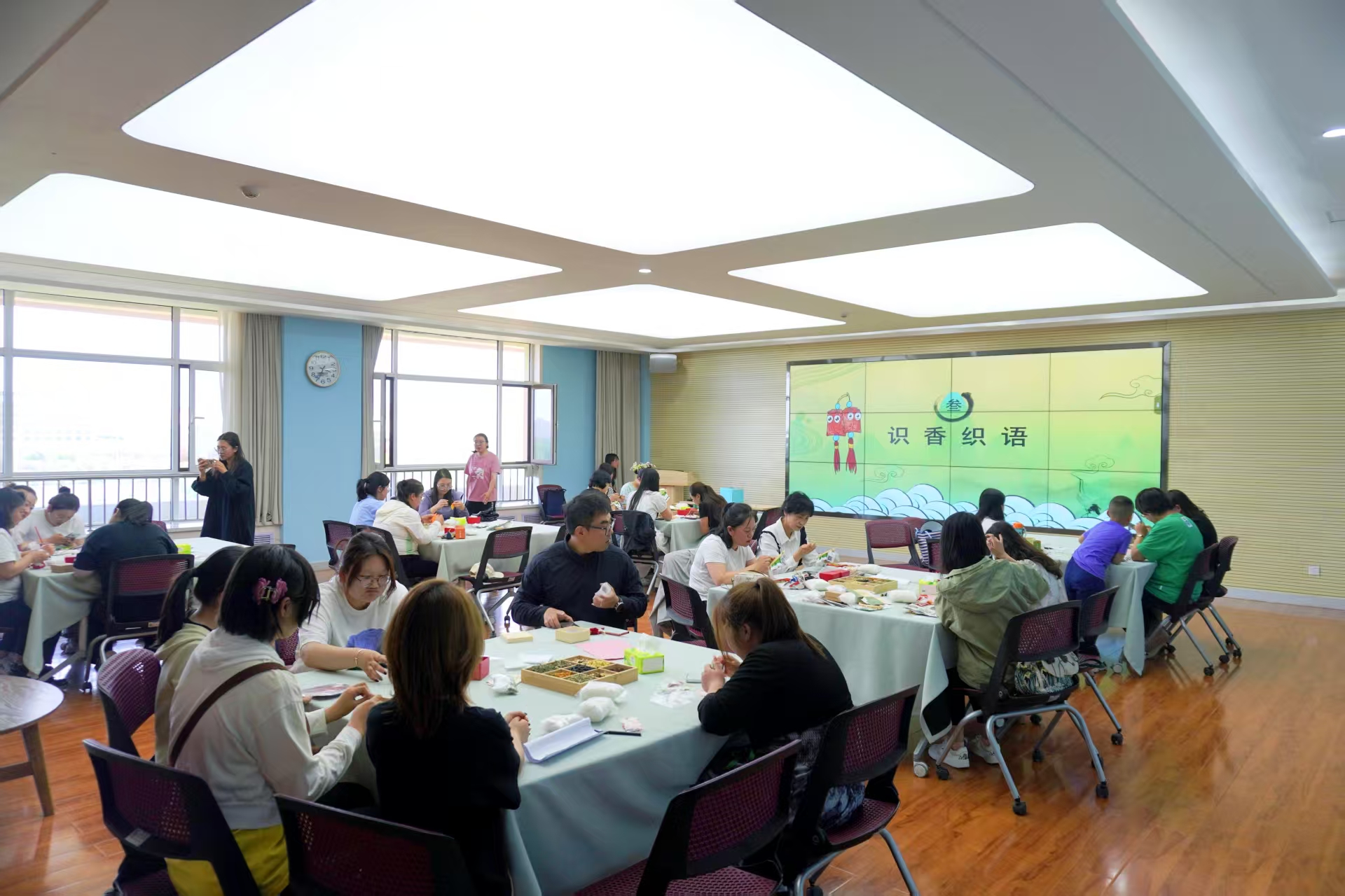 活动包括“溯古承今、鼻观移香、识香织语、悟有所得”四个环节。在“溯古承今”环节,主持人从文化象征、感官体验等多个维度,深入解读了香包与心理学的渊源。“鼻观移香”环节中,老师们踊跃参与香气猜猜猜活动,通过安神的茉莉花、提神的薄荷等天然香料愉悦身心,感受香气对情绪的调节作用,为后续制作积蓄灵感。进入“识香织语”环节,现场提供调香型、缝制型、刺绣型三种材料包,老师们根据当下情绪或期待,选择象征不同意义的彩色丝线,将喜爱的香料精心填充进荷包。穿针引线间,压力悄然释放,内心重归宁静。