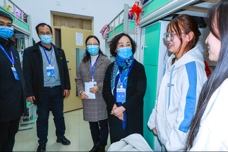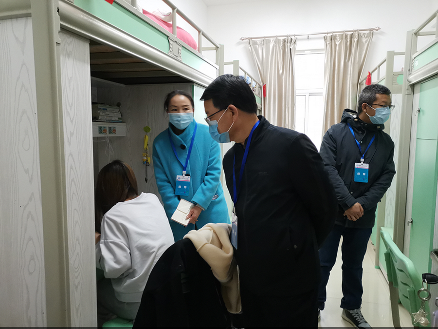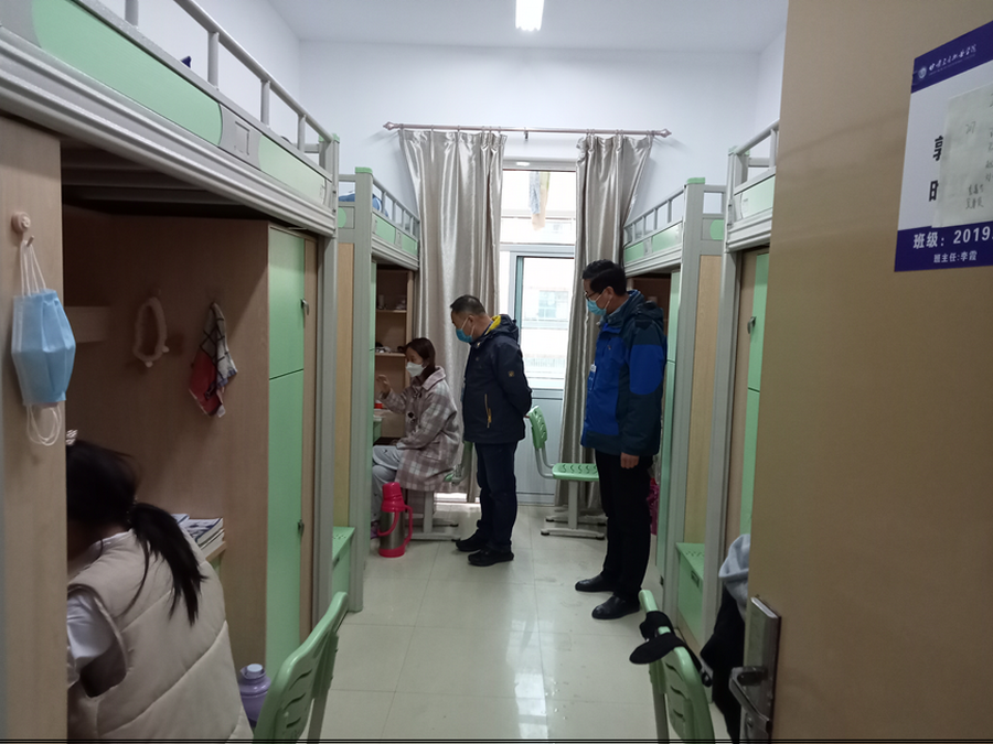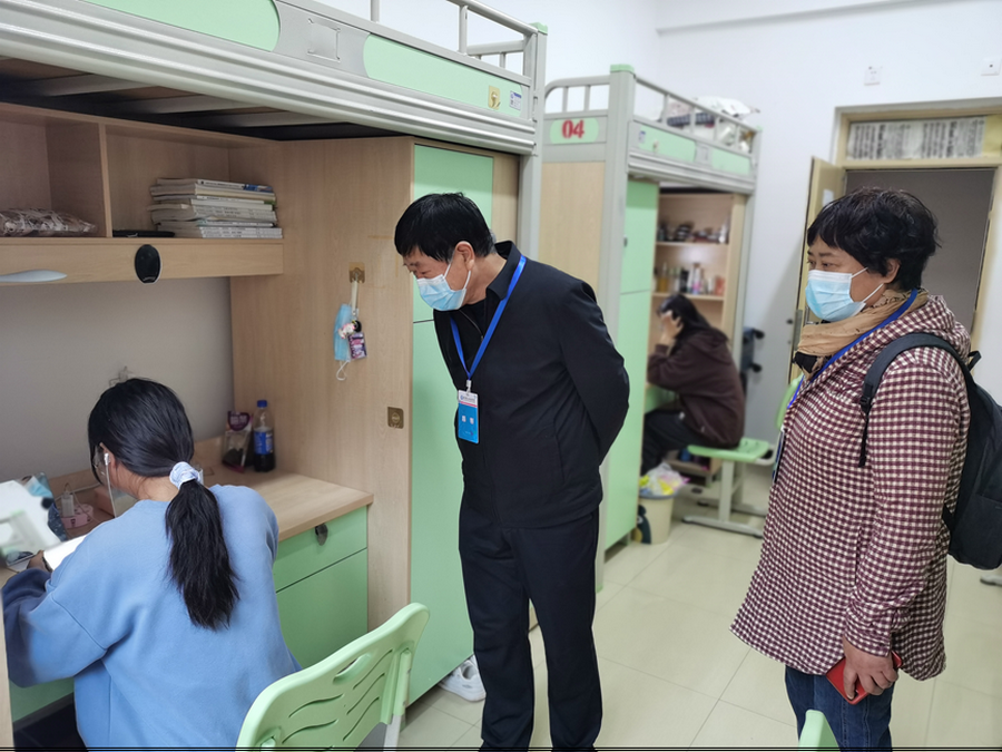 检查过程中,校领导分组带队,逐层深入学生宿舍,查看学习环境,督查教师线上到课情况,问询学生线上学习效果,鼓励同学们要在疫情封闭管理期间课业学习与身体健康并重,并认真听取了学生对学校线上教学工作的意见和建议。