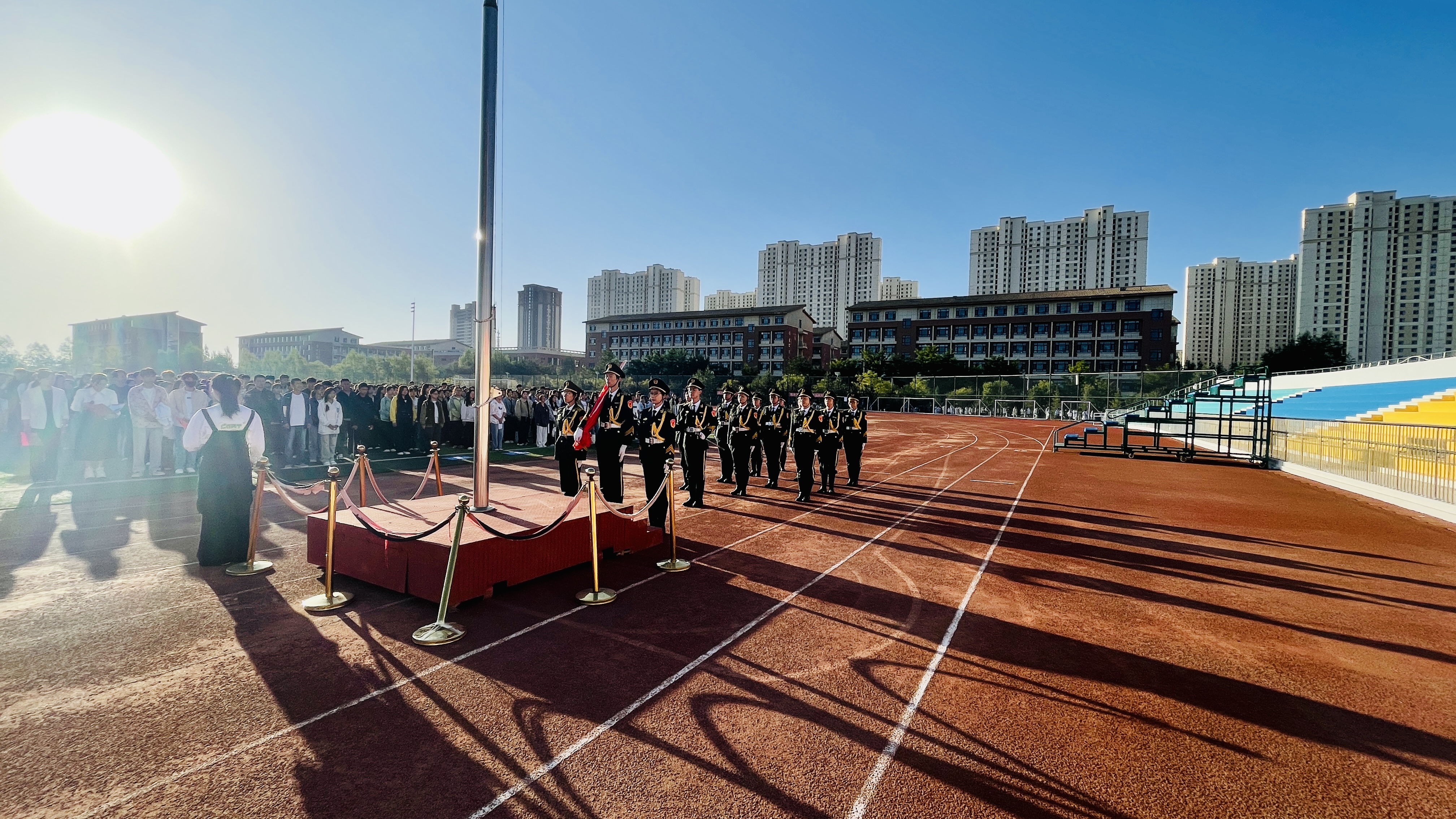 7时50分,升旗仪式正式开始。国旗护卫队队员迈着铿锵有力的步伐,护卫着五星红旗步入操场。伴随着雄壮激昂的《义勇军进行曲》,鲜艳的五星红旗冉冉升起,迎风飘扬。全体师生肃立行注目礼,高唱国歌,用嘹亮的歌声表达对祖国的无限热爱与崇高敬意,展现了新时代医学生炽热的家国情怀。