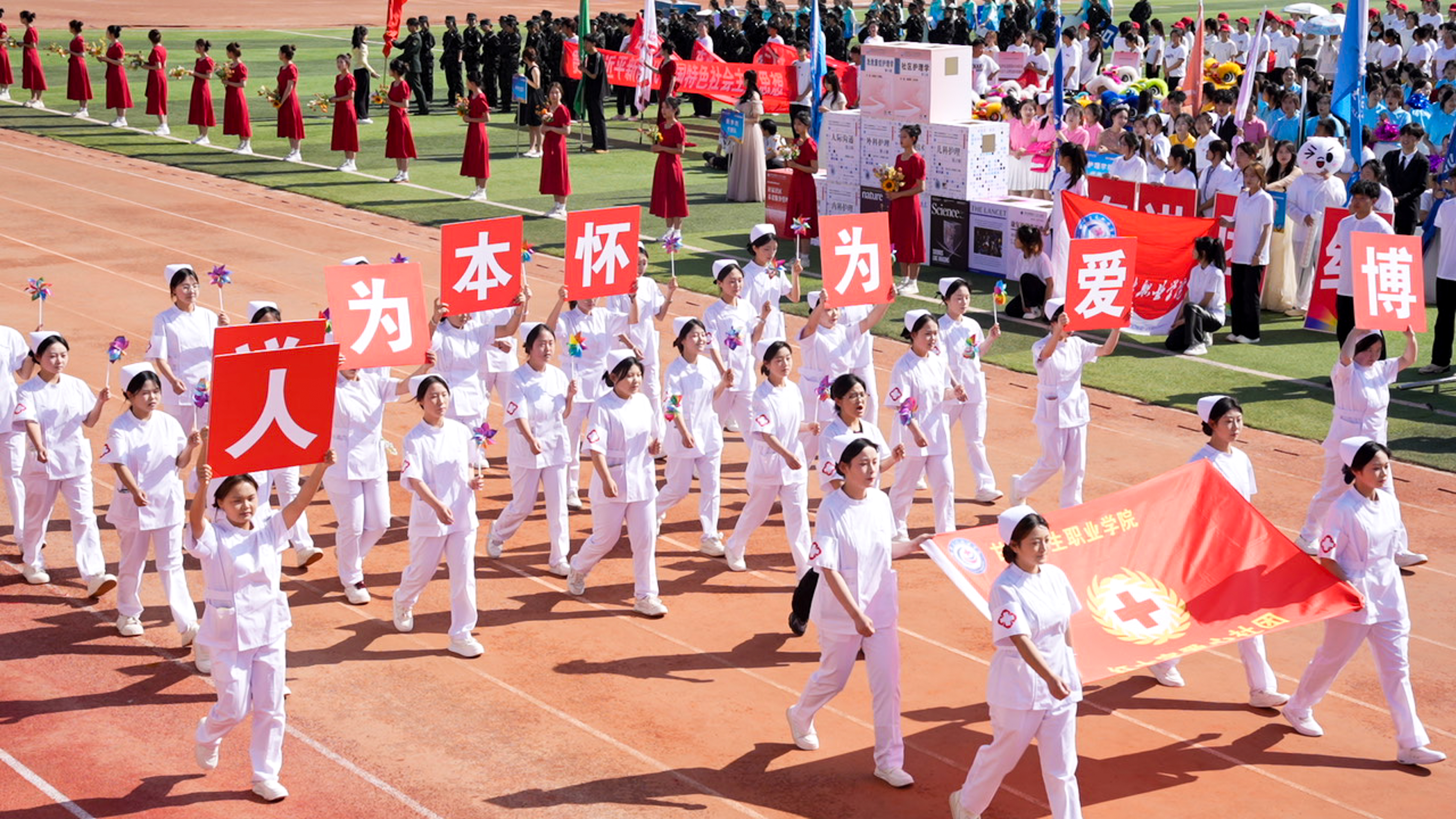 伴随着激动人心的进行曲,国旗、校旗、校徽、口号(文明、健康、团结、奋进)、彩旗队、花束队、裁判员代表队、各专业运动员代表队方阵依次入场。各方阵队伍步伐矫健、口号嘹亮,各专业和学生社团结合自身特色,精心设计了独特的过场表演,有的身着专业服装展示医护人员的风采,有的高举院训横幅表达医学生救死扶伤的郑重承诺,有的用响亮的口号传递着青春的激情,充分展现了同学们的意气风发与创新精神。由食堂厨师、物业工作者、校园超市员工组成的勤笃公司(服务保障)方队首次亮相运动会,展现了默默守护校园的后勤人团结奋进的别样风采。