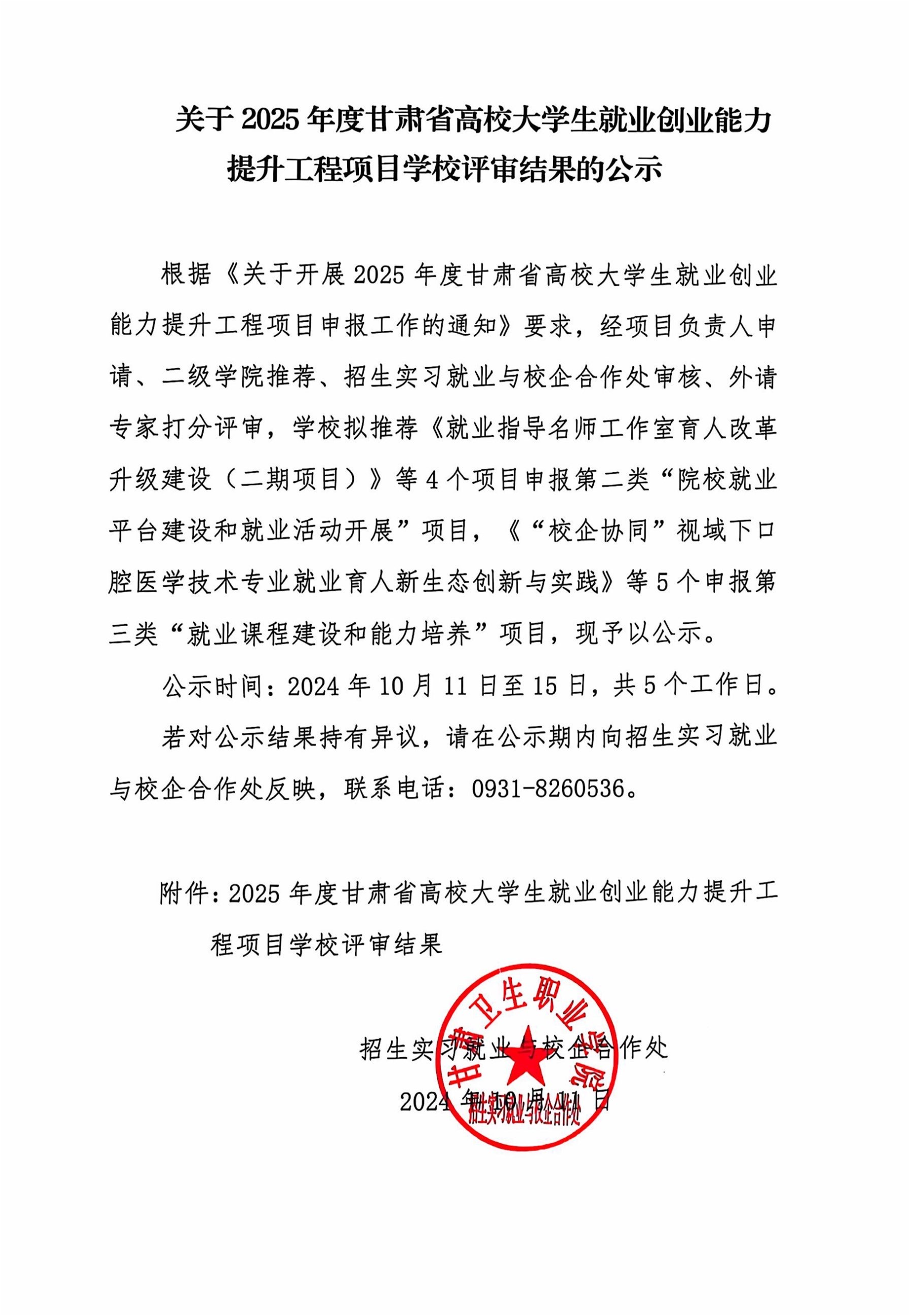 关于2025年度甘肃省高校大学生就业创业能力提升工程项目学校评审结果的公示