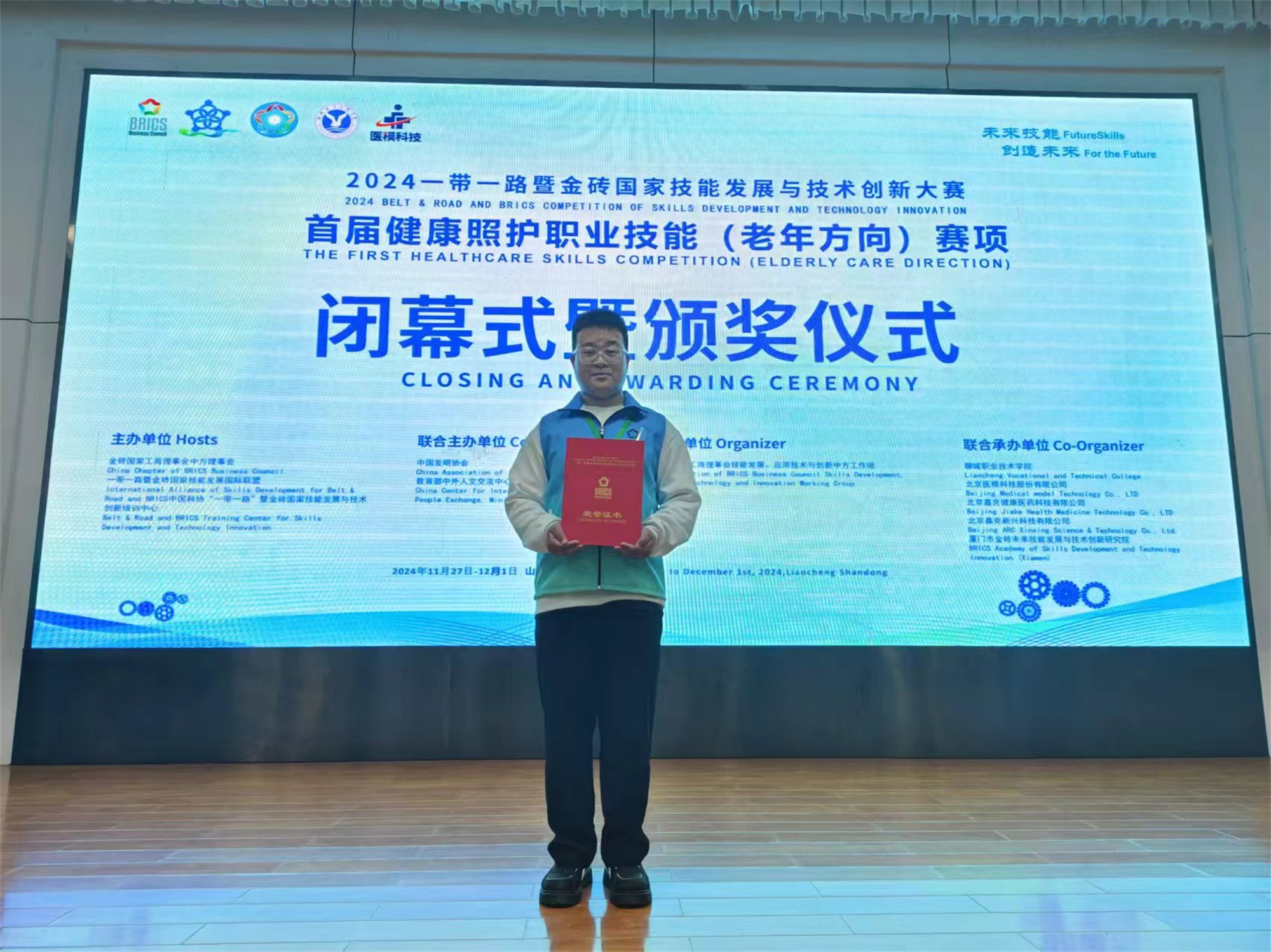 护理学院高奎同学在“2024一带一路暨金砖国家技能发展与技术创新大赛”首届健康照护职业技能(老年方向)赛项选拔赛中荣获一等奖发布时间:2024-12-06