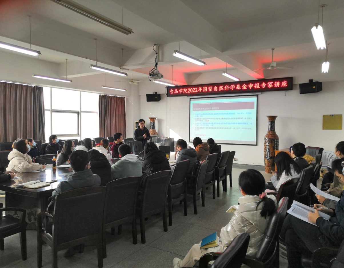 2022年1月13日,食品学院组织召开2022年度国家自然科学基金项目申报培训会,会议于常青校区科教楼809会议室召开,食品学院易阳教授、华中农业大学食品科技学院陈义杰副教授与会指导交流,二位专家分别围绕国家自然科学基金评审原则、申请书撰写、注意事项等对与会教师进行了培训指导,食品学院54位中青年教师参加了本次培训,会议取得圆满成功。