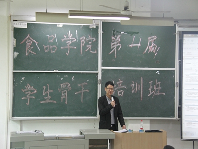 9日下午16:00,食品学院分党委副书记易文君结合自身实际工作经历,从为什么担当学生干部,做学生干部有哪些要求这两个方面与学生干部们展开了亲切交流,他着重强调学生干部的纪律性与组织性,“学生干部应该严格要求自己”,“学生干部应该要到第一线开展工作,学生组织不是官僚主义”,“学生干部永远是学生,不能脱离学生身份,要加强学生会和班级、班委的沟通”……易书记用真挚与朴实的语言告诫广大学生干部做人做事务实,同时殷切寄语广大学生干部珍惜此次学习机会。