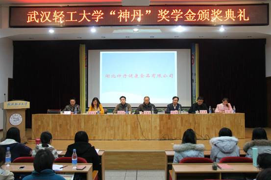 本报讯(食品学院 谢露 摄影 王琛)为了提高同学们的学习积极性,提高我校办学活力,以便更好的向人才强校的发展战略不断迈进,武汉轻工大学“神丹”奖学金颁奖典礼于12月12日14:30在常青校区科学报告厅拉开帷幕。出席本次活动的嘉宾有校党委副书记刘丰林、食品学院院长丁文平、分党委书记王宏光、湖北神丹健康食品有限公司常务副总经理李清逸、大客部经理戴淑香。