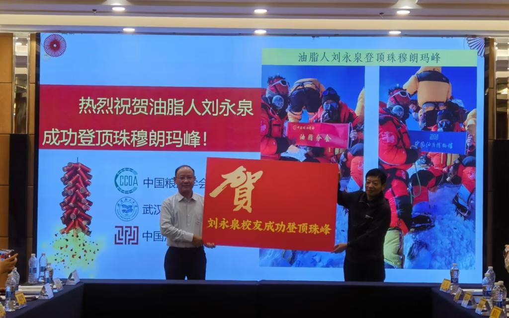 年会上,油脂行业校友会还对1982级校友刘永泉登顶珠峰表示祝贺,并颁发了贺礼。刘永泉校友分享了惊险的攀登珠峰经历,激励大家用良好的心态面对工作与生活中的各种挑战,不断勇攀人生高峰。