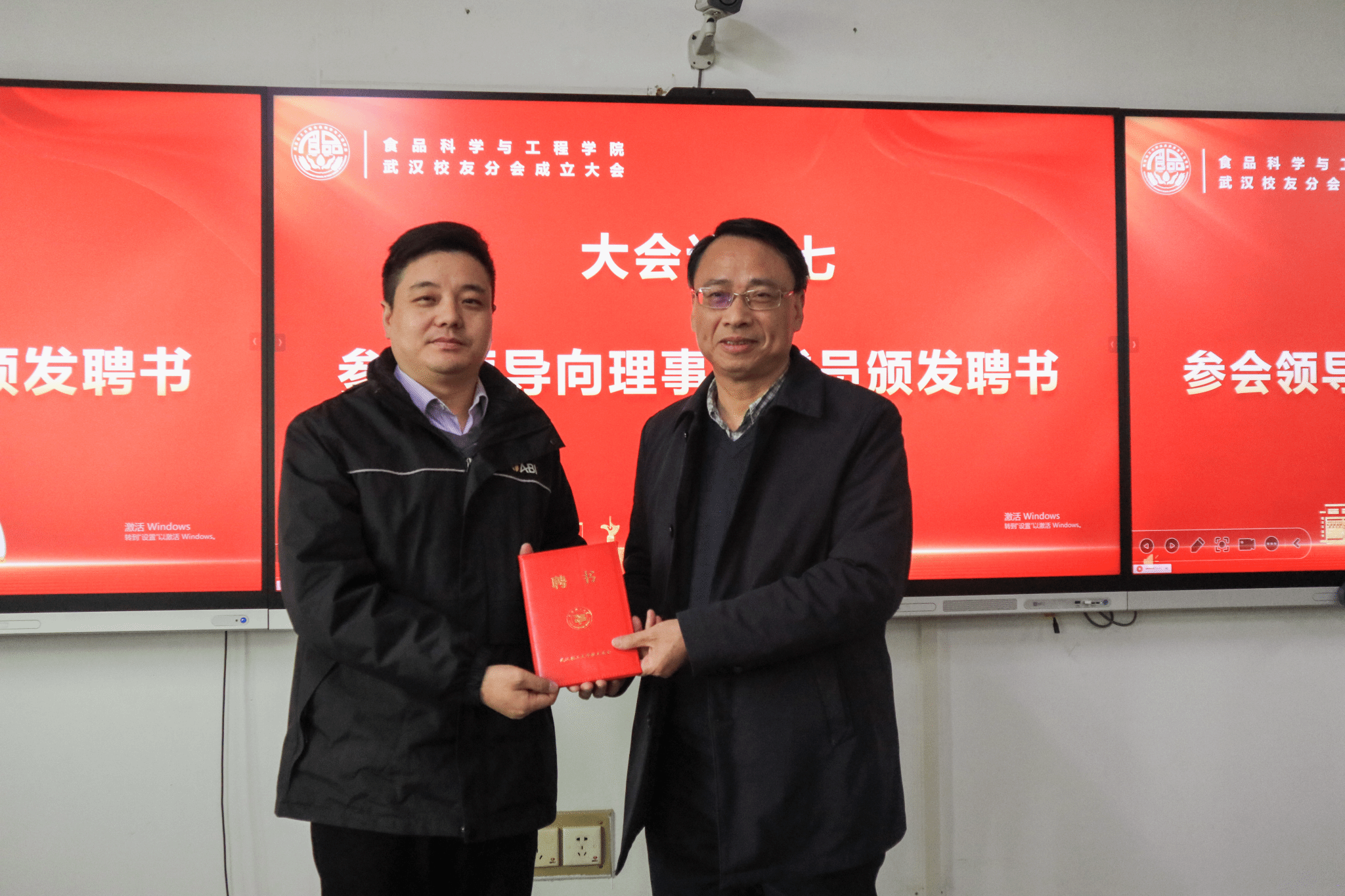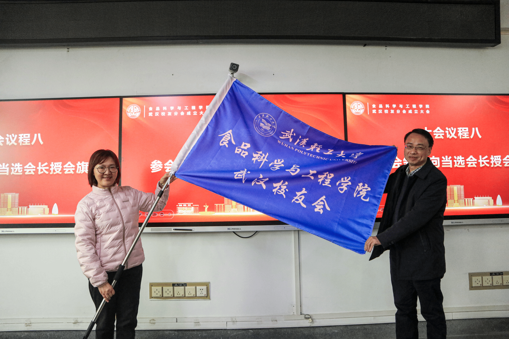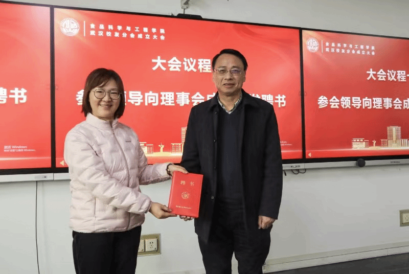 会议通过了食品学院武汉校友分会第一届理事会会长、副会长、秘书长和副秘书长建议名单。副校长侯永清向新任会长王雪芹授会旗,向第一届理事会成员颁发聘书。