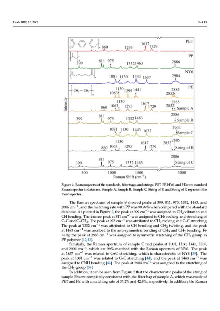 拉曼成像技术的分辨率可以达到1μm,可以检测和识别微塑料的种类,并能通过图像展示微塑料的分布和大小。实验中拉曼成像结合化学计量学方法(直接经典最小二乘)可以较为准确的检测到微塑料。对36个茶叶滤袋的检测结果表明,高达94%的滤袋在浸泡过程中释放MPs,释放的MPs主要来源于PET、PP、PE等无纺布滤袋和各种塑料制成的绳子。这些也表明,使用塑料食品过滤袋对软饮料进行分装时可能会因MP污染而对人类健康造成潜在风险。总体而言,基于拉曼成像的MP映射方法可方便直观地识别MP及其分布。此外,初步结果提供了一种研究MPs从过滤袋中释放的方法,对食品控制和MP监管具有重要意义。