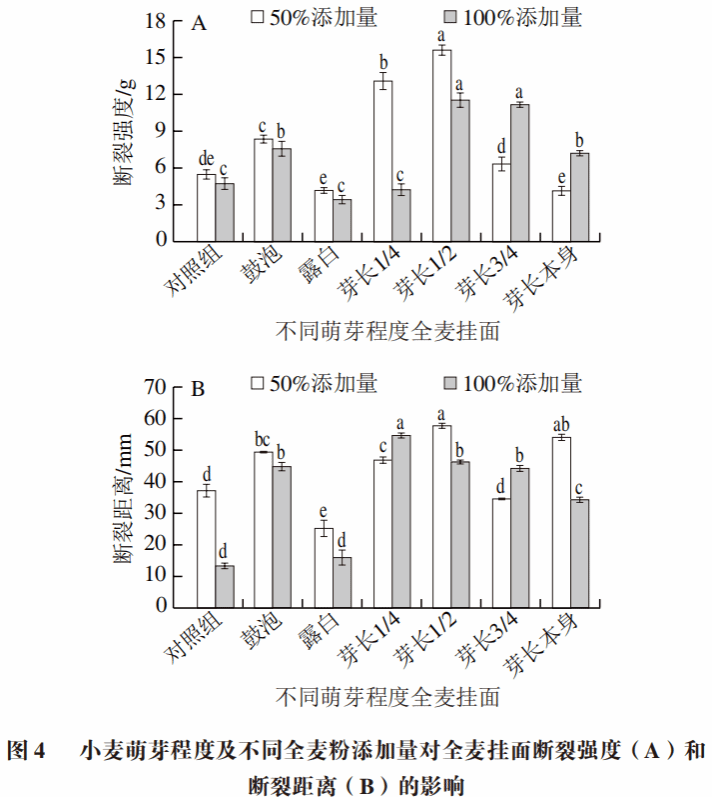 挂面的断裂强度和断裂距离可以模拟干挂面的弯曲折断率,断裂强度越大,断裂距离越长,在运输及保存过程中就难以断裂。由图4A可知,与对照组相比,50%及100%全麦挂面的断裂强度均在芽长1/2处达到最大值,分别增加了1.84 倍及1.44 倍。整体而言,全麦挂面断裂强度在发芽中期达到峰值,可能是中期淀粉未大量分解,蛋白质结构偏于稳定,同时麸皮有较强的保水能力,增强了全麦挂面的韧性及强度。50%全麦挂面的断裂强度大于100%全麦挂面,但后期(芽长3/4与芽长本身阶段)小于100%全麦挂面的断裂强度,是因为萌芽后期麸皮持水性更强,导致100%全麦挂面具有更强的断裂强度。由图4B可知,随着小麦萌芽程度的增加,相同添加量下的挂面的断裂距离均呈现波浪式曲线变化,50%全麦挂面在芽长1/2阶段达到最大值,较对照组提高了0.43 倍;100%全麦挂面在芽长1/4阶段达到最大值,较对照组增加了3.11 倍。总体而言,发芽中后期断裂距离较大,其原因与断裂强度相似,相对稳定的面筋蛋白结构及萌芽后麸皮较强的持水性。因此,小麦适当萌芽可以增强挂面的柔韧性和强度,使其在运输和销售中保证挂面完整性。