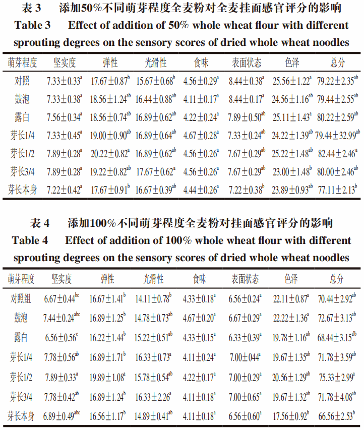 4 小麦萌芽程度对全麦挂面感官品质的影响