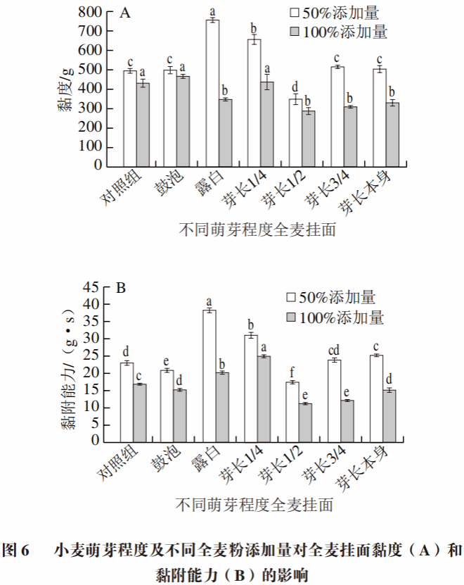 挂面的黏度会影响感官质量,黏度较低的面条具有较高的感官光滑度,煮后挂面会更加爽滑。全麦挂面黏度与全麦粉糊化特性有较大关联,发芽小麦的峰值黏度随萌芽程度加深先增加后降低。由图6可知,相同添加量条件下,随萌芽程度加深,全麦挂面黏度及黏附能力总体呈现先增加后降低的趋势,且均在芽长1/2阶段时达到最低点。发芽前期可能是淀粉的少量降解增加了峰值黏度,使挂面黏度及黏附能力增加。随着小麦萌芽反应进行,全麦粉中水溶性膳食纤维含量不断增加,它通过竞争水分子抑制了淀粉颗粒的膨胀与糊化,使淀粉溶胀减少,造成挂面黏度后续降低。在芽长1/2阶段达到最低,则可能是此阶段酶解使淀粉颗粒内部结构松散并失去抗膨胀能力的作用达到最大。此外,萌芽程度相同条件下,100%全麦挂面黏度及黏附能力均低于50%全麦挂面。总体来看,小麦萌芽中后期(小麦芽长1/2至芽长本身阶段)制备的全麦挂面爽滑性较好。
