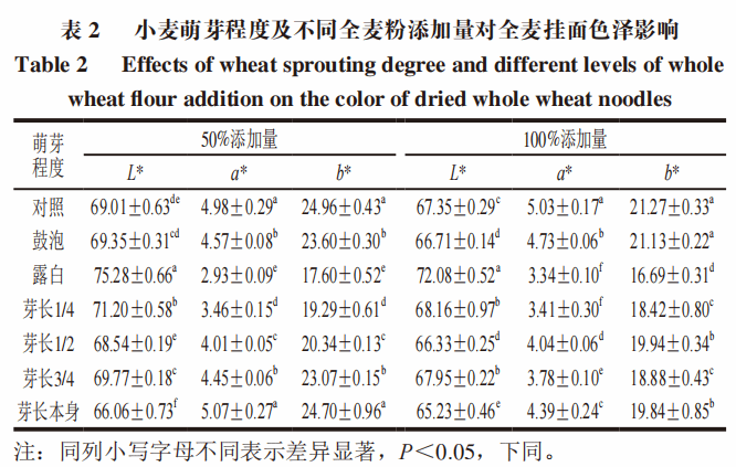 1 小麦萌芽程度对全麦挂面色泽的影响