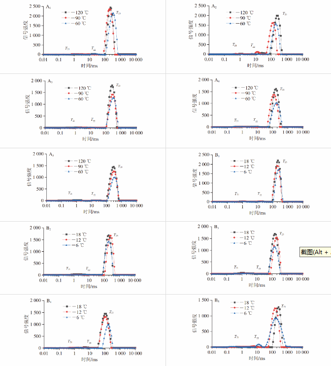 图5显示了不同液氮冻结温度和液氮冻结至不同中心温度的雷竹笋T2变化规律。图5中有3 个峰,分别代表通过氢键与雷竹笋大分子物质紧密结合的单分子层水(T21),结合在单分子层水外的多分子层水(T22)和与雷竹笋结合较弱的自由水或溶剂水(T23)。T21对应与细胞壁中的纤维素、半纤维素和果胶紧密结合的水;T22对应通过化学作用与细胞质中蛋白质、酶以及细胞骨架等紧密结合的水;T23对应与液泡中的糖及一些小分子物质结合的液泡中的水。