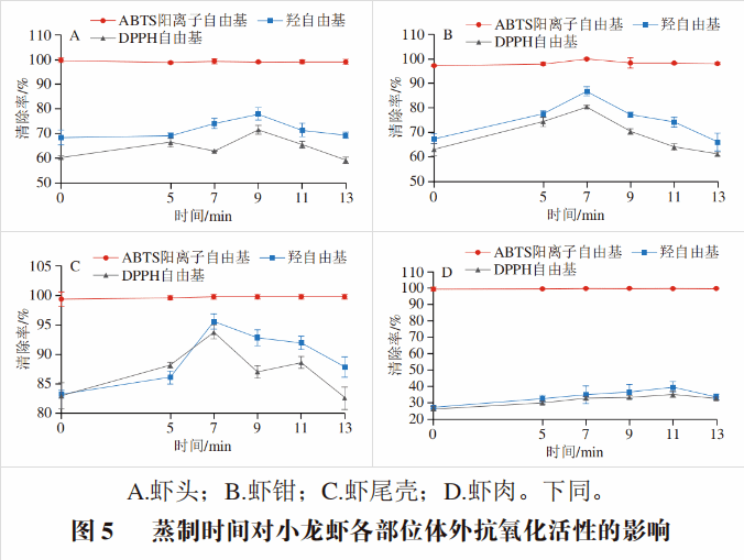 蒸制加热9 min时,虾头虾青素提取物的羟自由基、DPPH自由基清除率达到最高值,分别为78.09%和71.61%,虾钳和虾尾壳在加热7 min时对羟自由基和DPPH自由基的清除能力最高,其中羟自由基清除率为86.77%和95.56%,DPPH自由基清除率分别为80.41%和93.83%。继续延长加热时间,各部位的自由基清除能力逐渐减弱,加热13 min后,虾头、虾钳、虾尾壳的羟自由基清除率分别下降至69.33%、66.08%和87.80%。在水煮11 min时小龙虾虾头、虾钳和虾尾壳的DPPH自由基清除率和羟自由基清除率最高,其中虾头的DPPH自由基和羟自由基清除率分别为71.70%和78.47%,虾钳为79.52%和83.06%,虾尾壳为91.41%和95.97%。11 min后随着加热时间的延长,其自由基清除能力明显下降。在蒸制7 min时虾肉的虾青素含量最高(图1),但在蒸制11 min时达到最大的DPPH自由基和羟自由基清除率,可能是因为加热对虾青素的结构造成了破坏,促进了虾青素的异构化,虾青素反式结构变为顺式结构,顺式虾青素的抗氧化能力强于反式虾青素。继续延长加热时间后,其清除能力下降。