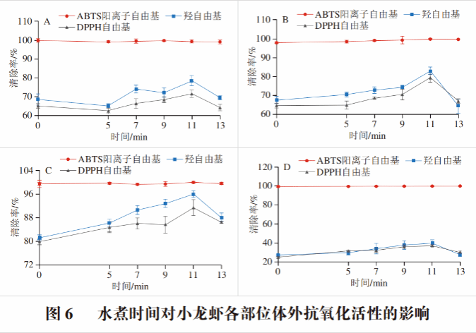 由图5、6可知,小龙虾不同部位虾青素提取物对自由基的清除能力存在差异。各部位对ABTS阳离子自由基都具有较高的清除能力。这是由于存在其他类胡萝卜素的影响,对ABTS阳离子自由基几乎可实现完全清除的效果。张旭飞等在研究凡纳滨对虾水煮加热过程中虾青素与体外抗氧化活性的相关性中发现,随着加热时间的延长,凡纳滨对虾中的虾青素几乎也可以达到对ABTS阳离子自由基完全清除的效果,与本研究结果相似。在不同热加工时间下,DPPH自由基和羟自由基清除率整体呈现先上升后下降的规律。有研究表明,热加工会促使反式虾青素向顺式虾青素转化,且顺式虾青素比反式虾青素具有更高的抗氧化活性。