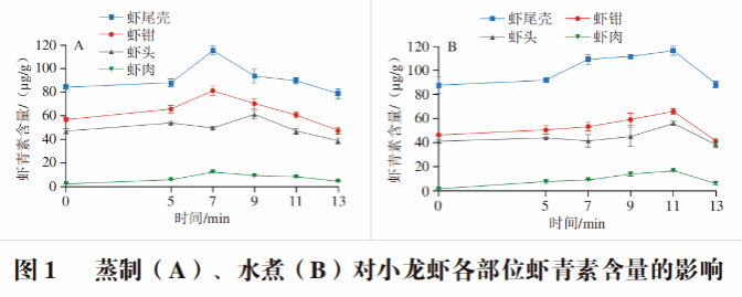 如图1所示,随着热加工时间的延长,蒸制和水煮小龙虾的虾尾壳、虾钳、虾头和虾肉的虾青素含量都呈现先上升后下降的趋势。且蒸制7 min时虾尾壳、虾钳和虾肉中的虾青素含量达到最大,而水煮加热11 min后,4 个部位虾青素含量达到最大值。热加工的过程中,小龙虾体内的脂肪酸、甲壳素以及蛋白质等因加热被破坏,蛋白质受热发生变性,复合物中的虾青素游离出来,释放出更多的虾青素,因此虾青素的含量不断增加。蒸制7 min后继续加热,虾青素含量随着加热时间的延长逐渐下降,加热至13 min后,虾尾壳、虾钳和虾肉中的虾青素含量分别下降至78.60、47.23 μg/g和4.41 μg/g,水煮加热时间至13 min,虾尾壳、虾钳、虾肉中的游离虾青素含量分别下降至88.16、40.78、5.79 μg/g。Swastawati也发现对虾在水煮10 min后虾青素含量降低。虾青素含量随着热加工时间的延长而下降的原因可能是过长时间的加热会使虾青素发生热降解、氧化分解以及异构化,除此之外,浸泡在水中可能会使部分类胡萝卜素蛋白复合物变性和溶解于水中,最终导致含量降低。蒸制小龙虾中游离虾青素达到最大值所需时间较水煮更短,可能是因为以沸水开始蒸制时小龙虾受热作用更强烈,导致释放出的虾青素更多。董志俭等在研究蒸煮加工对南美白对虾中虾青素含量的影响时发现,随着蒸煮时间的延长,虾青素含量先逐渐升高而后降低,且在加热2~6 min时蒸制南美白对虾虾青素含量高于水煮,与本研究结果一致。