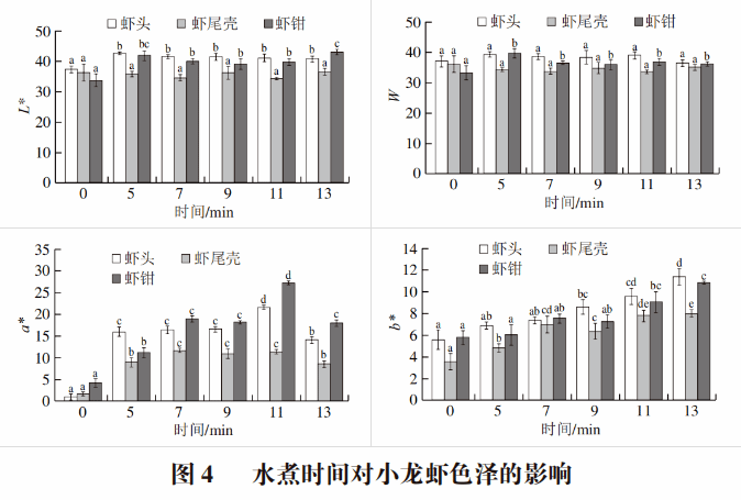 小龙虾的颜色是影响消费者选择的一个重要因素。一般来说,小龙虾经过热加工熟制后会变成红色,主要表现在小龙虾的外壳上。本实验对不同蒸制和水煮时间下小龙虾各部位外壳的色泽进行测定,由图3、4可知,小龙虾的大部分颜色指数(即L*、a*和b*值)在热加工后都有所增加。0 min为生鲜小龙虾L*、a*和b*的初始值。随着蒸制时间的延长,小龙虾的L*值出现缓慢增加,W值整体无显著变化。小龙虾在水煮加工中的L*、a*、W值的变化趋势与蒸制相似,L*和W值整体变化趋势不大,经水煮加工后出现小幅度的增加。蒸制、水煮过程中小龙虾的a*值发生了显著变化(P<0.05),随着热加工时间的延长,a*值呈现先上升后下降的趋势,a*值的变化主要与虾青素的含量有关。在蒸制、水煮过程中,小龙虾体内与虾青素结合的蛋白质等组分逐步受热降解,导致虾青素从蛋白结合态释放出来,游离的虾青素含量增多,使小龙虾发生红变现象,导致a*值升高;当蒸制时间超过7 min或水煮时间超过11 min时,游离态虾青素自身可能发生受热降解、氧化分解或异构化以及随着水分降低而流失,最终导致虾青素含量减少,造成a*值下降。b*值的变化主要与脂质氧化有关,加热后游离虾青素的含量显著增加,酯化虾青素含量减少,随着热加工时间的延长,黄度逐渐上升。小龙虾中脂质氧化程度提高,其中虾头中的脂质含量最高,因此其黄变现象也最明显。Ho等认为酯化虾青素向游离态虾青素的转变可能是产生色素的重要途径,因此加热后的小龙虾会显红色。b*值随着水煮时间的延长呈逐渐上升趋势,可能是因为脂质氧化以及美拉德反应褐变生成黄色素。结合表3可知,热加工中小龙虾各部位a*值的变化与虾青素含量的变化存在正相关关系,有较高的相关性(r>0.4),与张旭飞等得出的结论一致。小龙虾色泽变化还与类胡萝卜素结合蛋白有关,Pan Chuang等从克氏原螯虾的外壳中纯化了两个与红色相关的蛋白,在加热处理过程中其含量与克氏原螯虾表面的红色变化表现出强烈的相关性,并被鉴定为血蓝蛋白亚基。今后可结合起来进行深入研究。