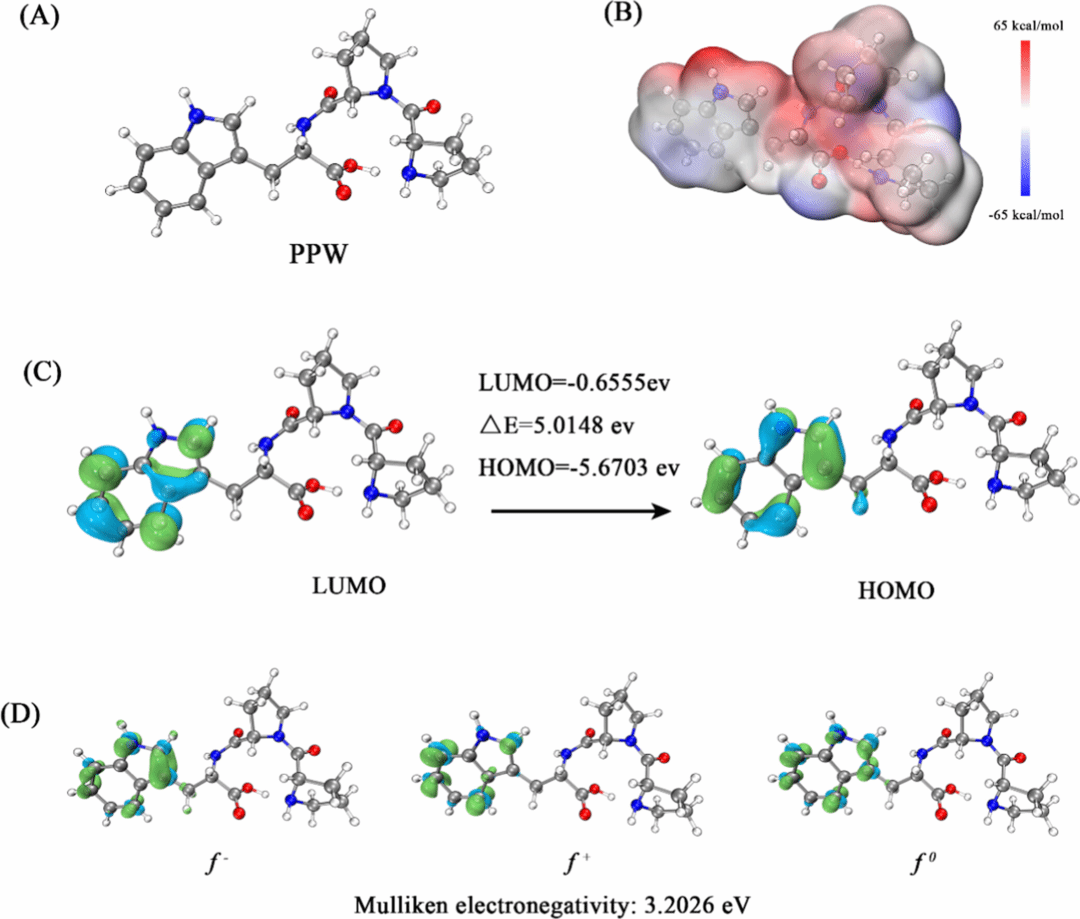 作者进一步引入量子化学分析,从结构—活性关系角度揭示PPW的“关键位点”。结果显示,色氨酸(Trp)侧链上的吲哚环是电子供体和受体的集中区域,是清除自由基、参与蛋白相互作用的核心活性中心。这也解释了为何PPW在体内外均表现出稳定而显著的生物活性。