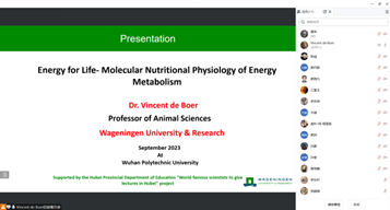 受湖北省教育厅“世界著名科学家来鄂讲学计划”项目资助,荷兰瓦格宁根大学的Vincent de Boer教授于2023年9月8日受邀在武汉轻工大学进行了一场精彩的线上学术报告。本次讲座的主题是“Energy for Life- Molecular Nutritional Physiology of Energy Metabolism”。