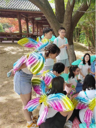 人间芳菲三月天,桃红柳绿醉春烟。趁着美好的春意,同学们分为“青蝴蝶”和“花蝴蝶”两组,开始“寻找春味”。湿地公园的生态环境好,隐藏着不少食材和药材。通过探寻,同学们找到了桑椹、蛇莓、槐花、蒲公英、酢浆草、车前草、艾草、菖蒲、蒌蒿等,大家进一步体会到“药食同源”,例如艾草可做成美食“青团”,也可入药做成“灸”,以疏通经络、祛除体寒。随后,大家开展了“春季习俗与养生”知识竞答,认识到春季应养肝健脾,放风筝、踏青等传统活动能疏发肝气,避免郁结;食用香椿、韭菜等温补清淡的菜肴可以疏通经络、补益气血。
