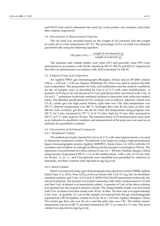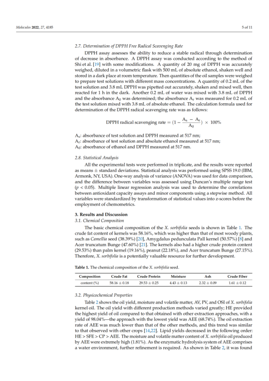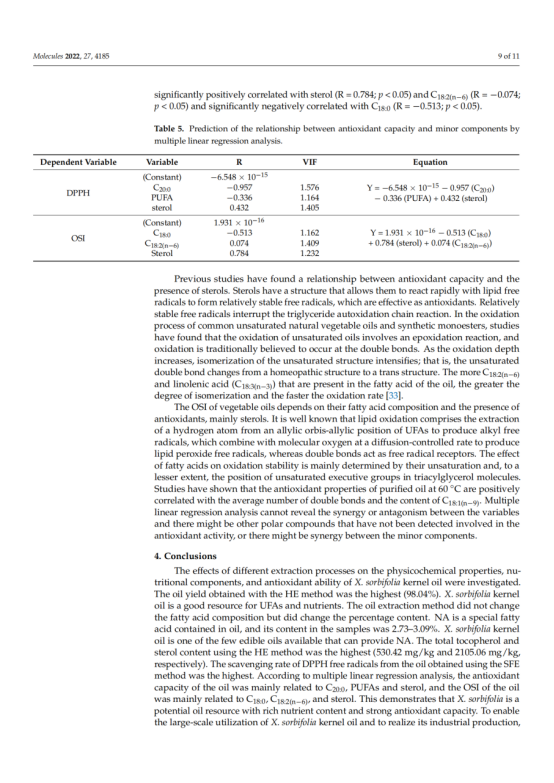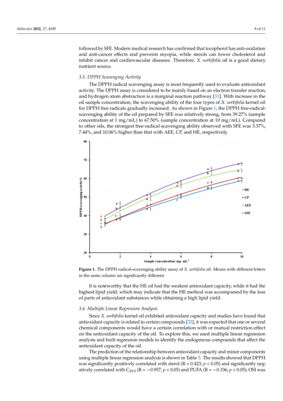 本文对冷榨法(CP)、正己烷萃取(HE)、水酶法(AEE)和超临界流体萃取法(SFE)制备的文冠果仁油的出油率、理化性质、脂肪酸组成、营养成分及抗氧化能力进行了研究和比较。结果表明,文冠果油中单不饱和脂肪酸的含量较高(49.31 ~ 50.38%),其中油酸(30.73 ~ 30.98%)和神经酸(2.73 ~ 3.09%)含量最高,提取方法对脂肪酸的组成和含量影响不大。文冠果油是神经酸的极佳来源。此外,HE法的油得率最高(98.04%),氧化稳定指数最高(9.20 h),生育酚含量最高(530.15 mg/kg),甾醇含量最高(2104.07 mg/kg)。SFE产油对DPPH的清除率最高。考虑到油脂的健康和营养价值,HE是一种很有前途的加工方法。多元线性回归分析表明,油的抗氧化能力与甾醇、硬脂酸含量呈负相关,与亚油酸、花生酸、多不饱和脂肪酸含量呈正相关。这些信息对提高文冠果的营养价值和工业化生产具有重要意义。