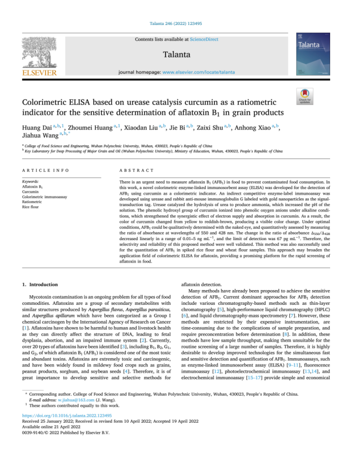 2. 研究团队以姜黄素作为显色试剂,以脲酶标记的纳米金作为信号转导标签,对米粉和面粉中的AFB1含量进行定量分析。所构建的AFB1定量分析模型的相关系数为0.99,检测限为67 pg/mL,成果发表在《Talanta》。文章链接:https://doi.org/10.1016/j.talanta.2022.123495