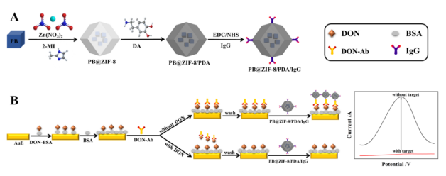 3. 研究团队利用沸石咪唑酯骨架(ZIF-8)负载普鲁士蓝(PB)来提高PB的稳定性,多巴胺(DA)通过自聚合在PB@ZIF-8表面形成聚多巴胺(PDA)涂层得到复合材料PB@ZIF-8/PDA,用作电化学探针。在最优条件下,差分脉冲伏安法(DPV)的峰值电流与DON浓度在0.1~5000 pg/mL范围内呈良好的线性关系,检测限为0.0186 pg/m,且具有良好的选择性和稳定性。研究表明所开发的免疫传感器对DON具有出色的分析性能,对于开发粮食中DON的快速检测方法具有重要意义,成果发表在《Food Chemistry》。文章链接:https://doi.org/10.1016/j.foodchem.2022.134842