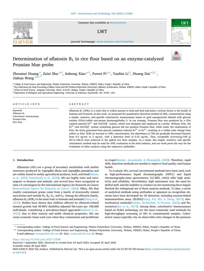 1. 研究团队开发了一种基于葡萄糖氧化酶(GOx)催化生成PB纳米颗粒的比色生物传感器,与免疫分析相结合,以GOx标记的纳米金作为信号转导标签,催化混合底物(葡萄糖及其PB前体物)形成PB。建立了以PB为比色探针的间接竞争免疫法来检测粮食中的痕量AFB1。研究所构建的AFB1定量分析模型的相关系数为0.98,检测限为0.35 ng/mL,对其他常见的真菌毒素也具有良好的选择性以及准确性,成果发表在《LWT-Food Science and Technology》。文章链接:https://doi.org/10.1016/j.lwt.2022.113500