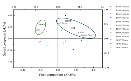 焙炒法制备的浓香油茶籽油因其特有的香味而广受欢迎。本研究通过理化性质、有害物质、感官评价和风味分析,探讨了不同焙炒温度(90℃、120℃、150℃、180℃)和烘烤时间(20 min、40 min、60 min)对浓香油茶籽油的影响。结果表明,120℃焙炒20 min制备的浓香油茶籽油脂肪酸组成合理,酸价(0.16 mg/g)、过氧化值(0.13 g/100 g)、茴香胺值(2.27)、邻苯二甲酸二丁酯含量(0.04 mg/kg)较低,1,1-二苯代苦基苯肼自由基清除活性(224.51 μmol TE/kg)较高。多维度风味分析表明,120℃/20min组较高的青草味评分(5.3)分来源于壬酸,较低的异味(2.2分)归因于低含量的2-甲基丁酸。主成分分析表明,120℃焙炒20 min可以保证浓香油茶籽油最佳风味和品质。本研究可以为浓香油茶籽油的制备起到指导作用。