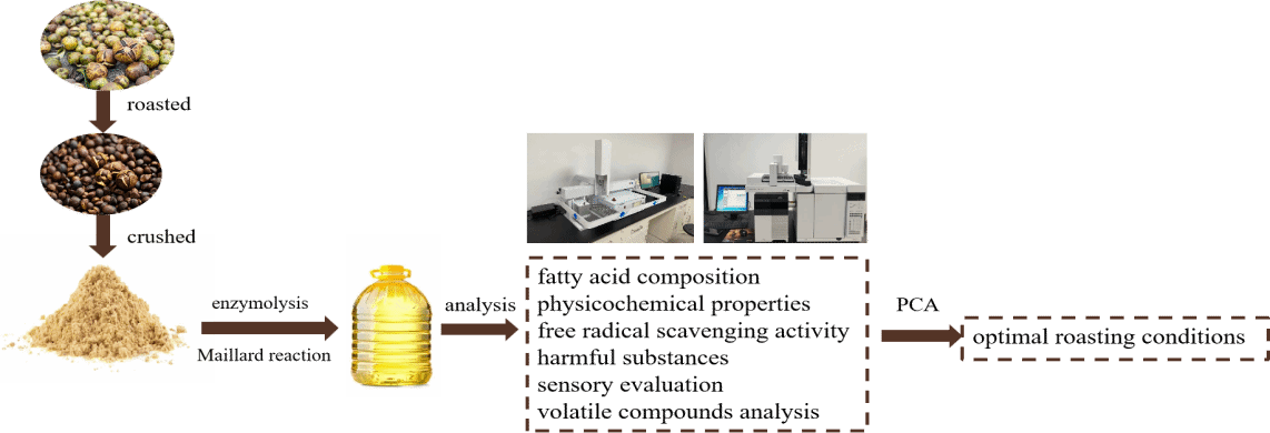油茶树是东南亚特有的木本,在中国已有2300多年的种植历史。根据国家中国国家统计局显示,2022年我国油茶籽产量为4100千吨。浓香油茶籽油(FCSO)由于独特的风味和光滑的口感在中国南方广受欢迎。最近酶法和传统方法广泛用于制备浓香油。在酶法中,还原糖与氨基酸之间的Maillard反应在风味的形成中起到重要作用并且适宜条件(酶的最适温度和pH值)可以保障油的品质