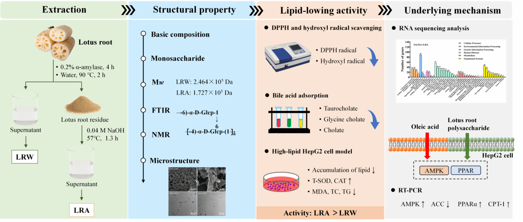 Lotus root is a widely popular aquatic vegetable with edible and medicinal values. Here we report the structure and lipid-lowering activity of two lotus root polysaccharides LRW (lotus root polysaccharide by water extraction) and LRA (lotus root polysaccharide by alkali extraction), that were extracted by aqueous and alkaline solution respectively. The results showed that the yield of polysaccharide from lotus root could be significantly improved by alkali extraction. Basic composition and structural characterization showed that the total sugar contents of LRW and LRA were 96.83 % and 73.66 %, and the molecular weights were 2.464 × 105 Da and 1.727 × 105 Da, respectively. LRW and LRA had the similar structure that the main backbone consisted of →4)-α-D-Glcp-(1→ with branches at C-6 site. Both LRW and LRA could scavenge DPPH and hydroxyl radicals effectively, and have strong adsorption capacity to cholate salts in a concentration-dependent manner. In HepG2 cells, LRW and LRA inhibited the accumulation of lipid droplets induced by oleic acid, and increased the activity of T-SOD and CAT, meanwhile, reduced the level of MDA, TC and TG, showing good lipid-lowering activity. In comparison, the lipid-lowering effect of LRA was better than that of LRW. In addition, gene sequencing and RT-PCR showed that AMPK, ACC, PPARα and CPT-1 were essential for LRA to exert a lipid-lowering effect. This study provides a theoretical basis for the extraction and lipid-lowering application of lotus root polysaccharides.