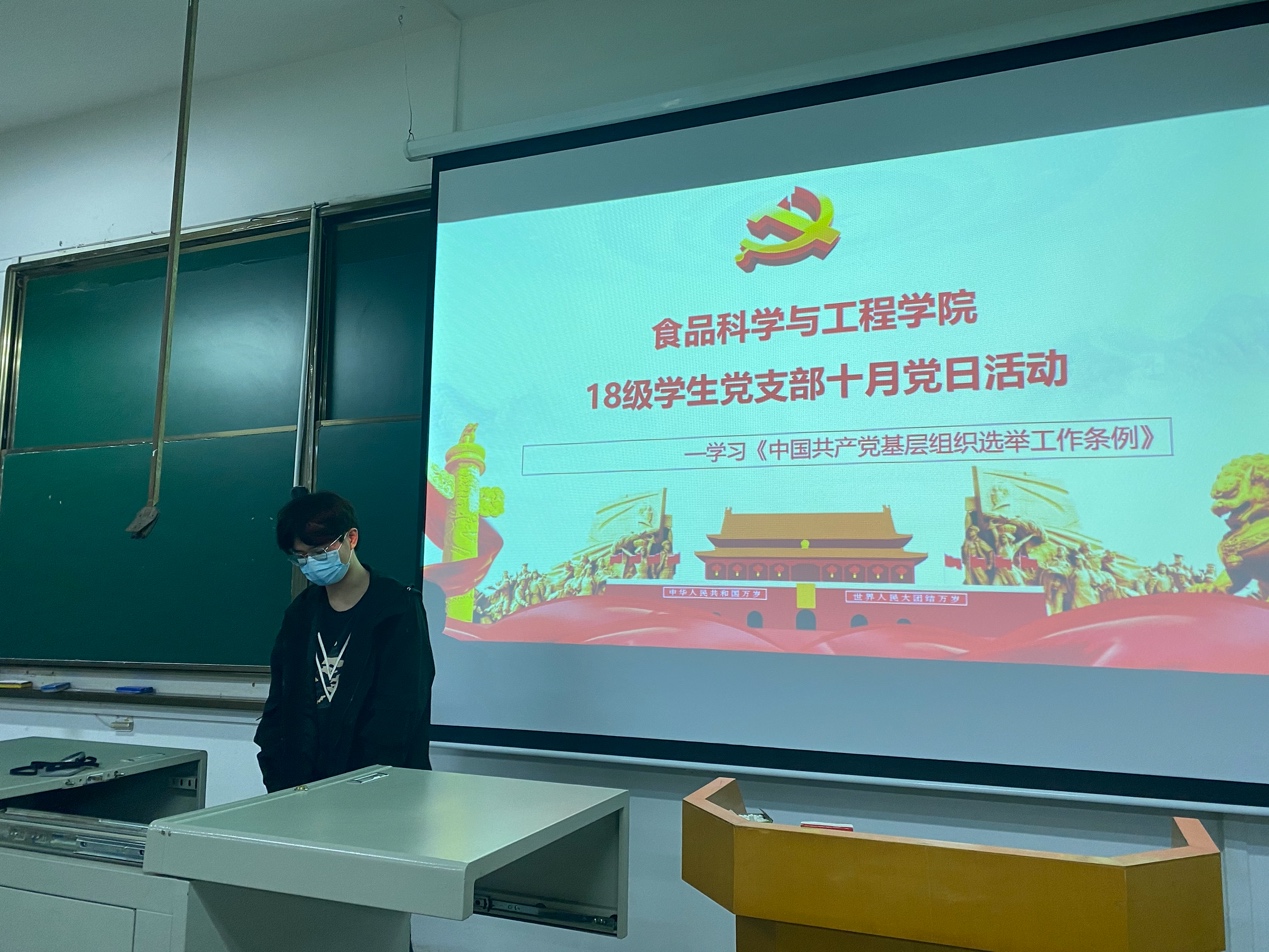 为了深入贯彻习近平新时代中国特色社会主义思想,贯彻落实新时代党的建设总要求和新时代党的组织路线,坚持和加强党的全面领导,坚持党要管党、全面从严治党,健全党的民主集中制,完善党内选举制度,增强基层党组织政治功能,提升基层党组织组织力,食品学院18级学生党支部于 10月29日晚5点30分在科教211教室集中学习了《中国共产党基层组织选举工作条例》。