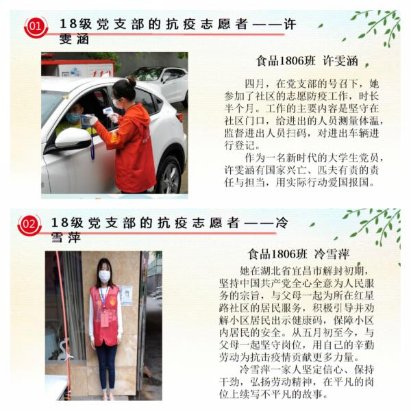 另一位党员冷雪萍不仅自己报名,更号召家人一同参与到社区的抗疫志愿活动中。五月初至今,她与父母轮班值守在小区出入口,检查每一位出入居民的健康码,并为困难居民提供运送蔬菜等服务,一家人共同谱写着自己的战疫故事。“爸妈一听到我主动报名做志愿者便从行动上表示了支持,和我一起加入到社区的抗疫志愿服务队中,”她自豪的说到,“值班时有热心居民送来矿泉水、风油精等生活物资,是对我们防疫工作的关心与支持,也是我坚持下去的动力;我告诉自己在岗位上必须恪守职责,不能给我们18级党支部和学校丢脸。”