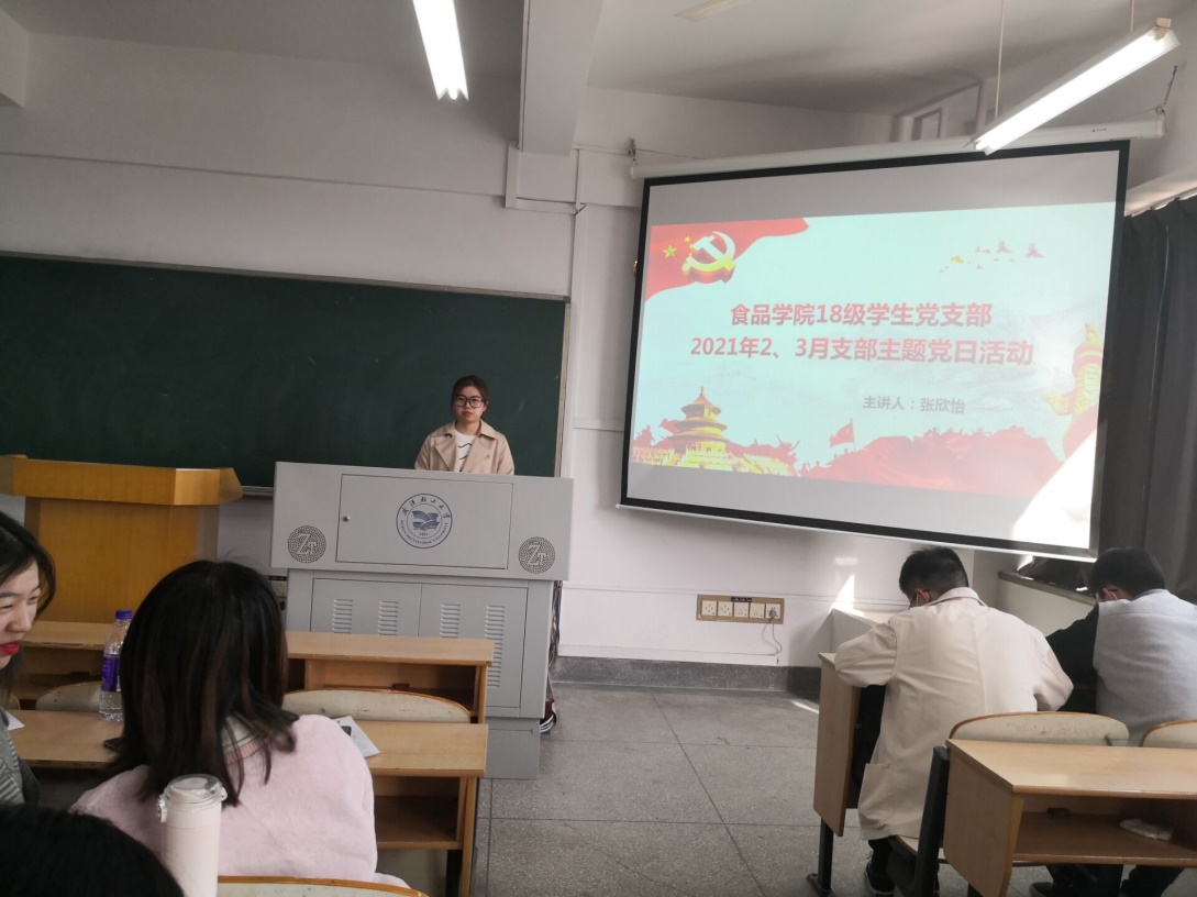 2021年3月24日下午三点五十分,食品学院18级学生党支部在科教705教室开展了3月支部主题党日活动,全体党员学习了修订后的《中国共产党党员权利保障条例》和习近平总书记在党史学习教育动员大会上的重要讲话精神。