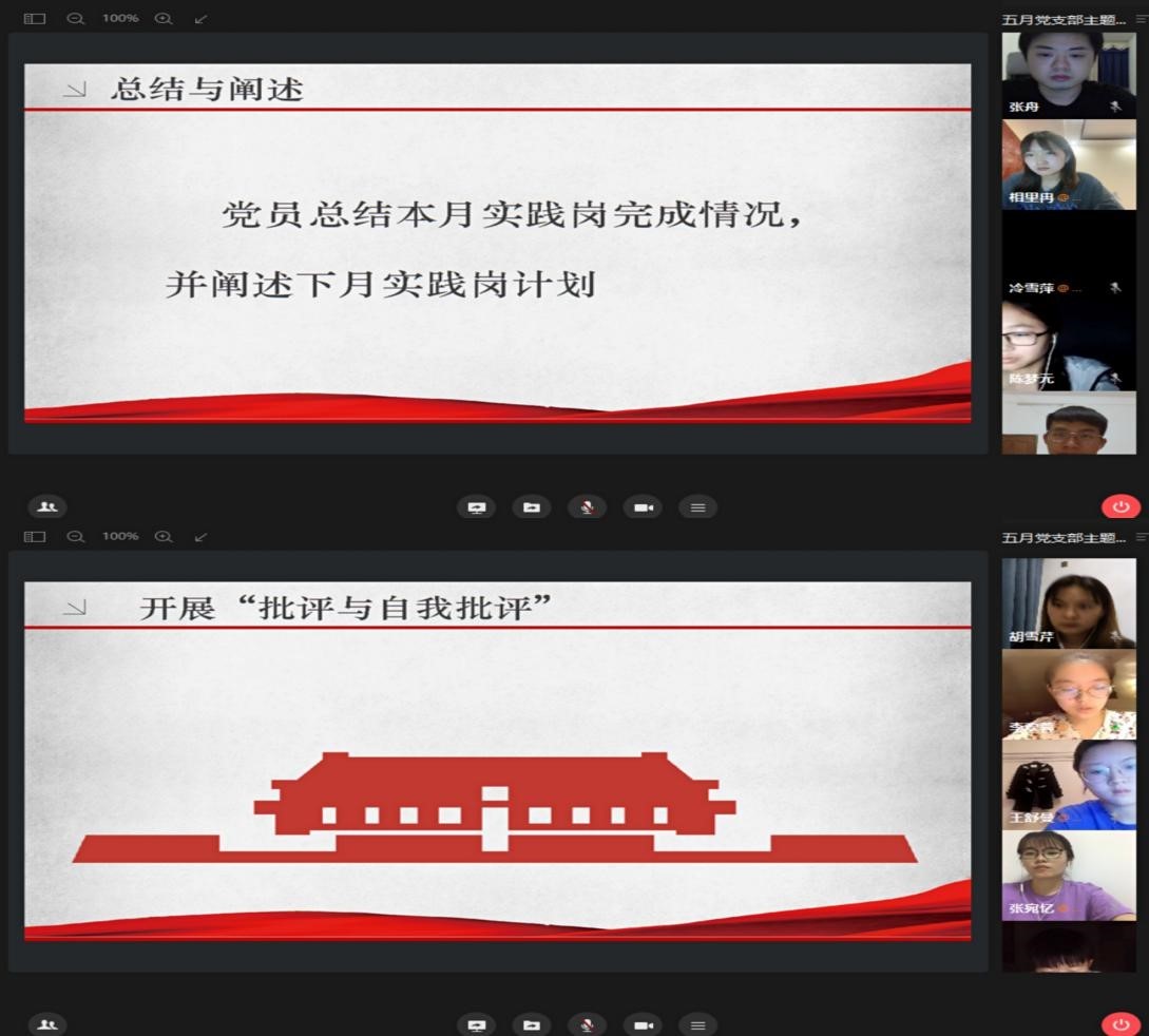 本月理论学习内容告一段落后,学生党员汇报了本月党员实践岗任务完成情况,并阐述接下来的工作计划,张舟老师进行了点评并提出相关建议,他总结道:“本月党员实践岗完成得不错,作为党员要发挥先锋模范作用,发挥党员对团组织的影响力,重视对困难学生的帮扶。”朱远韧同学通报了本支部成员“学习强国”的在线学习情况,强调党员应积极学习党的先进思想,不断巩固自身的党性修养,在理论学习上要有更强自觉、在学懂弄通做实上要有更高要求。随后,活动进行到党员批评与自我批评环节,由张舟老师带头,支部全体党员依次对自己本月思想、学习、工作等各个方面进行了自我批评,也提出了其他党员的不足与改进意见。