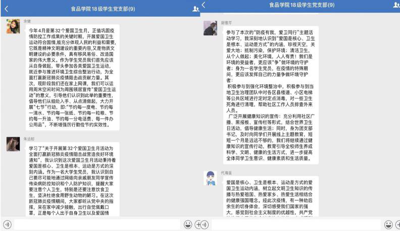 随后支部党员们都踊跃发言,党员朱远韧说到:“作为一名大学生党员,我认识到自己要尽可能地通过网络向身边的人宣传传染病防控知识和个人防护知识,提醒大家要注意个人卫生。在这次新冠肺炎疫情期间,大家都听从党中央的指挥,呆在家中减少接触,出行自觉佩戴口罩,在今后的生活中,我们仍要继续维护卫生,避免新的重大公共卫生安全问题爆发。”党员胡雪芹补充到:“身为一名学生党员,在疫情的特殊期间,更应该发挥自己的力量争做环境守护者;同时,身为团支部书记,本月我也及时在团支部中组织开展线上主题教育,进一步提高全班同学卫生意识,引导同学养成科学、文明、健康的生活方式。”