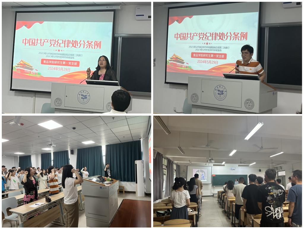 近日,食品学院研究生党支部书记纷纷走上讲台,带领全体研究生党员深入学习了《中国共产党纪律处分条例》(以下简称《条例》),筑牢党员的党纪法规意识。