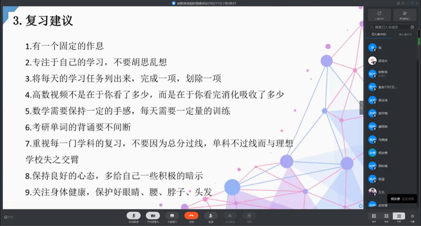接着,会议进行答疑环节,在疫情面前虽然只能线上开展交流,但同学们考研热情不减,纷纷提出有关复习方法和如何择校等问题。16级分享的同学依次给大家解惑,知无不言、毫无保留的分享学习经验,帮助大家选择目标院校,解决现阶段的问题,从而更高效的进行接下来的复习。