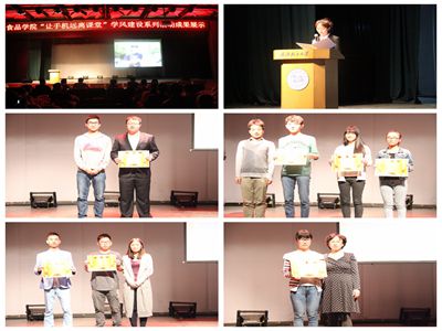 分享中,全院13个班级自编自导班级微电影,方式多样、形象生动地展示了手机对大学生学习方方面面的影响:食品1503班《手机再爱我一次》通过有无手机前后个人在学习和恋爱中的不同,号召广大同学“不要让青春喂给了手机”;食品类1504班通过改编《放下手机》的歌曲呼吁大家放下手机;食品类1508举办微视频大赛,倡议同学们“关闭小窗口,拥抱大世界”……