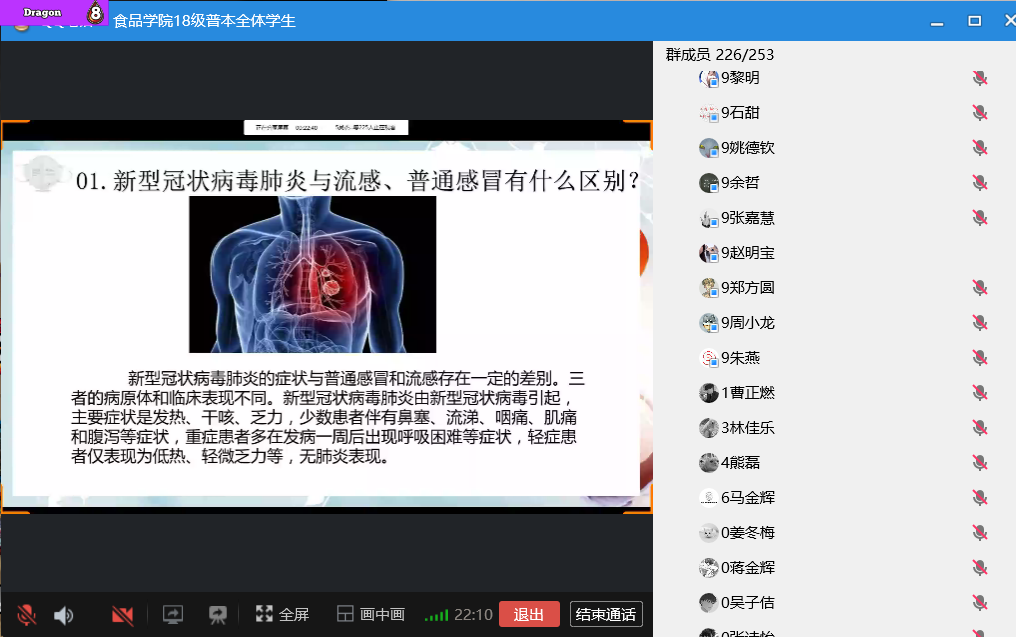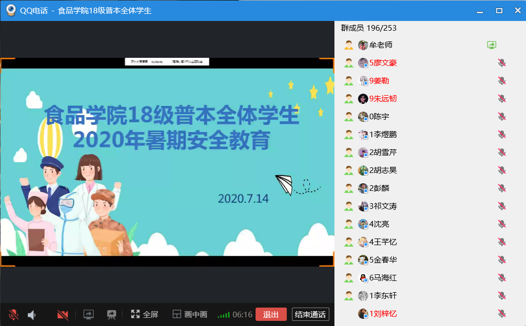 暑假期间,为提高学生安全防范意识和能力,使其切实保护自己的人身和财产安全,度过一个安全、愉快的假期,2020年7月14日下午三点整,食品学院18级普本辅导员牟星老师通过在线会议的形式召开了2020年暑期安全教育年级大会,食品学院18级全体学生参加了本次大会。