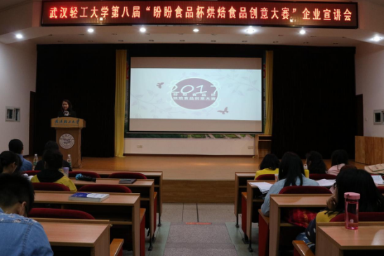 本报讯(食品学院 科协 摄影:陈熙强)盼盼食品杯大赛将至,为普及盼盼杯相关知识,鼓励同学们利用烘焙工艺,开发创新性健康产品,食品学院科协于4月26日晚在常青校区科学报告厅举办了武汉轻工大学第八届"盼盼食品杯烘焙食品创意大赛"企业宣讲会。食品学院分党委书记王宏光、中国食品科技学会学术部主任助理工程师张欣然等领导同志参加了本次活动。食品学院分团委书记聂铭静主持了本次宣讲会。