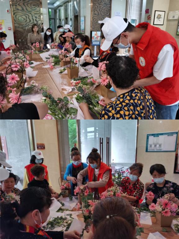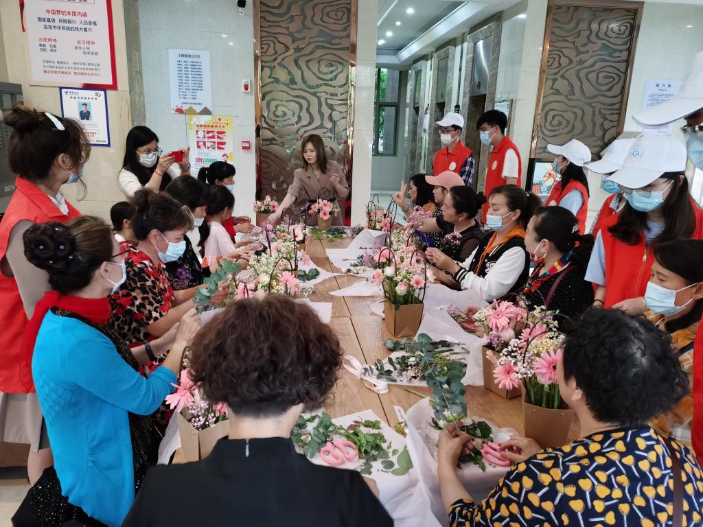 2021年5月21日下午,武汉轻工大学食品学院青年志愿者协会协助常青花园六社区在六小区十栋公共客厅举办了艺术插花课堂。