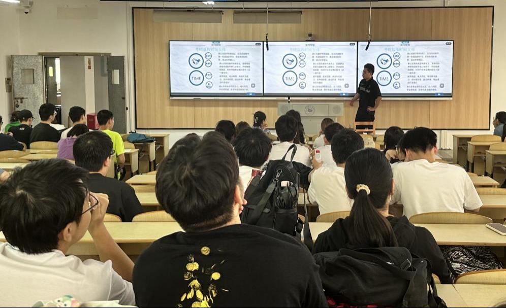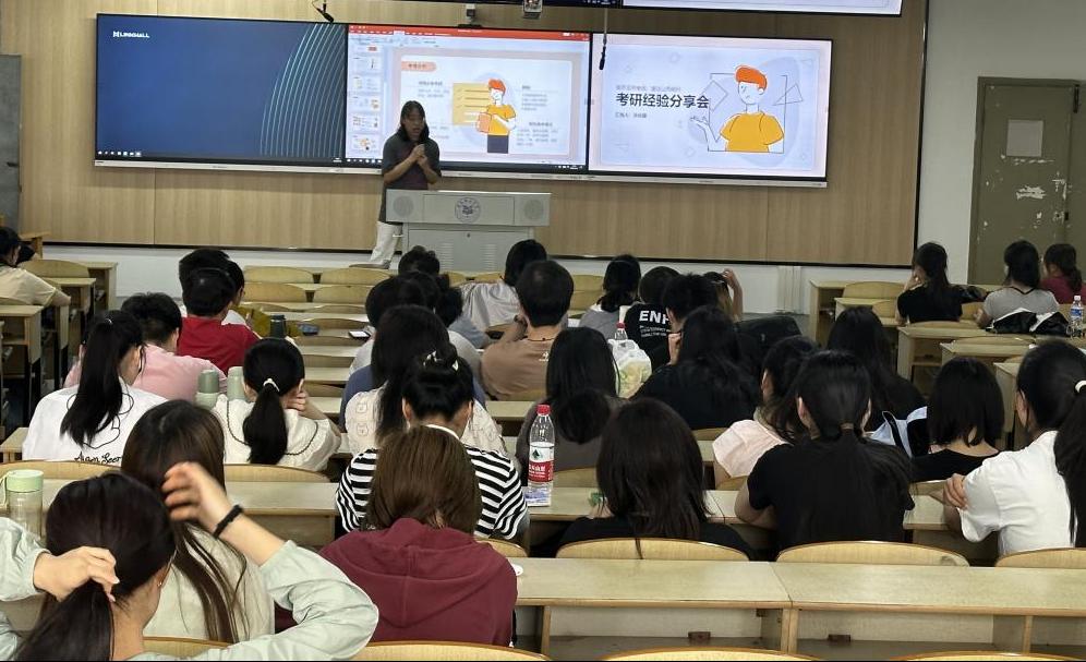 分享会上,24届优秀考研学生代表黄学杰、黄晶和汤铭鑫依次分享了考研择校标准、备考时间安排、初试复习经验等干货,针对高数、英语、政治、专业课等各类学科的学习特点,学长学姐们也分别介绍了各自的学习经验。在分享学习经验之余,学长学姐们对于备考过程中可能遇到的各类问题,包括动力不足、压力缓解以及如何保持最佳身心状态等都给出了许多建议,帮助学弟学妹们树立信心,培养良好的备考心态。