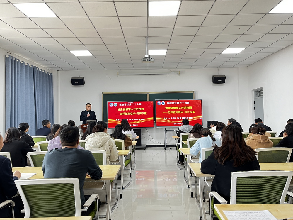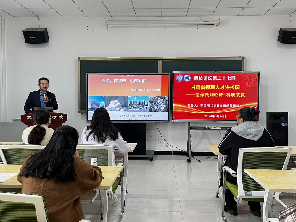 3月26日,医学技术学院举办第二十七期“医技论坛”,邀请了甘肃省妇幼保健院硕士研究生导师李天刚主任医师作了主题为“怎样做到临床——科研双赢”的学术报告,题目为《医者做临床,也做科研——热爱生活从热爱工作开始》,就临床与科研的关系、如何平衡两者关系等内容展开了深入讨论,学院全体教职工参会。报告会由医学技术学院副院长张春雨主持。